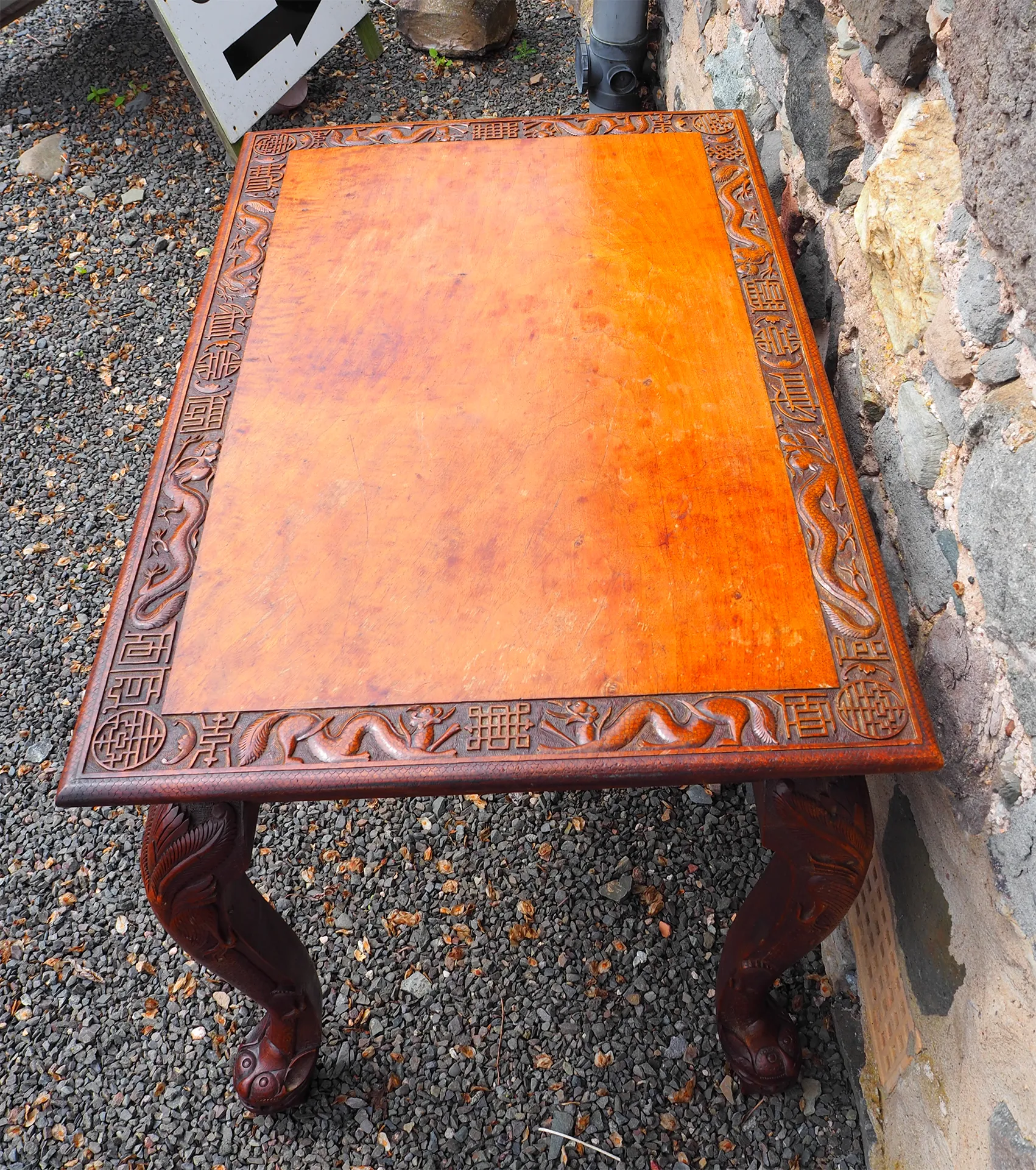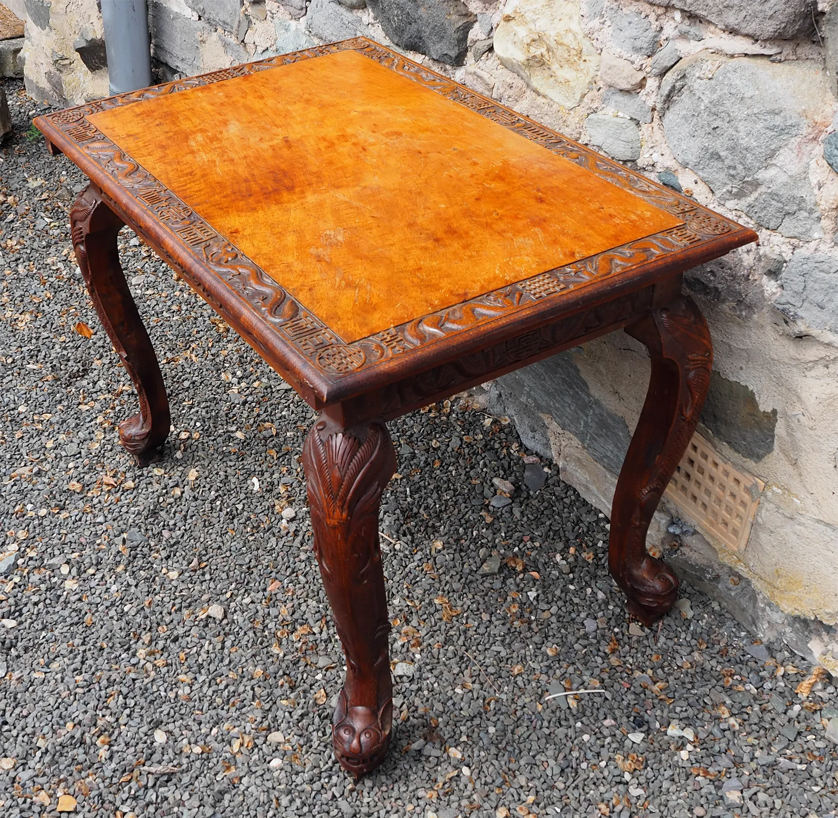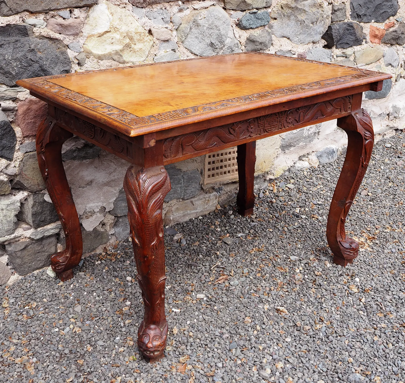 Late 19th century Chinese carved hardwood "Dragon" centre table. The base with carved and stylised square cabriole legs with carved frieze all round. The top with matching carving around the edge part. The top lifts off the base which is totally original. The colour is very good, it almost looks like walnut. Finished all round so can be free standing.