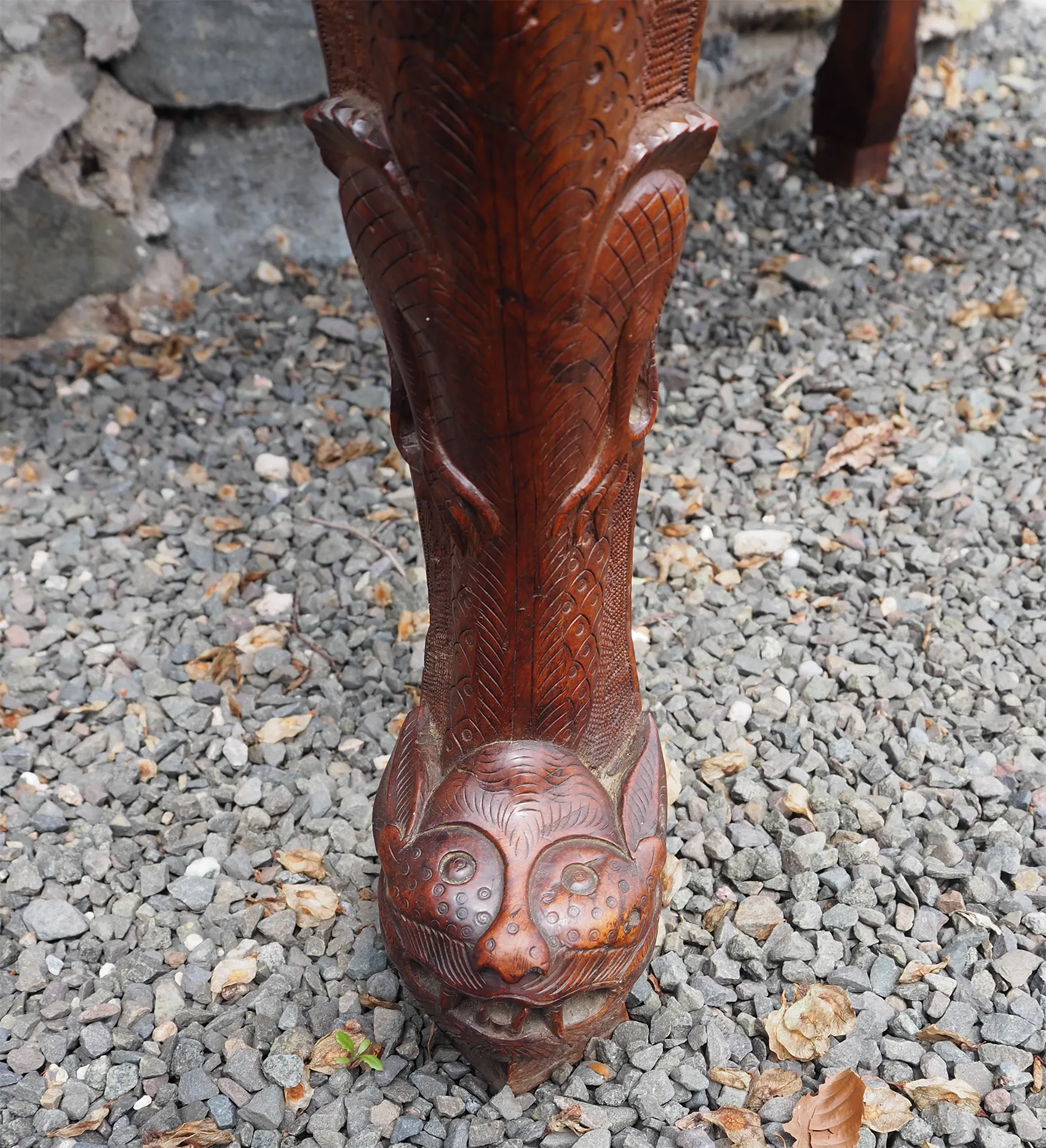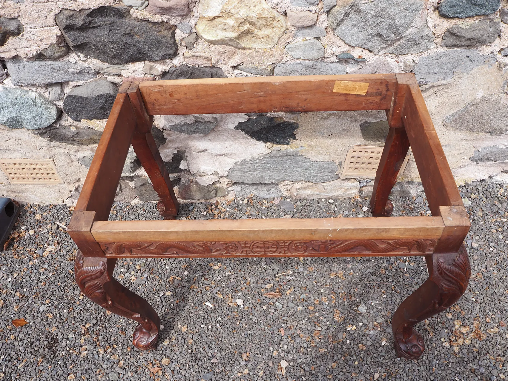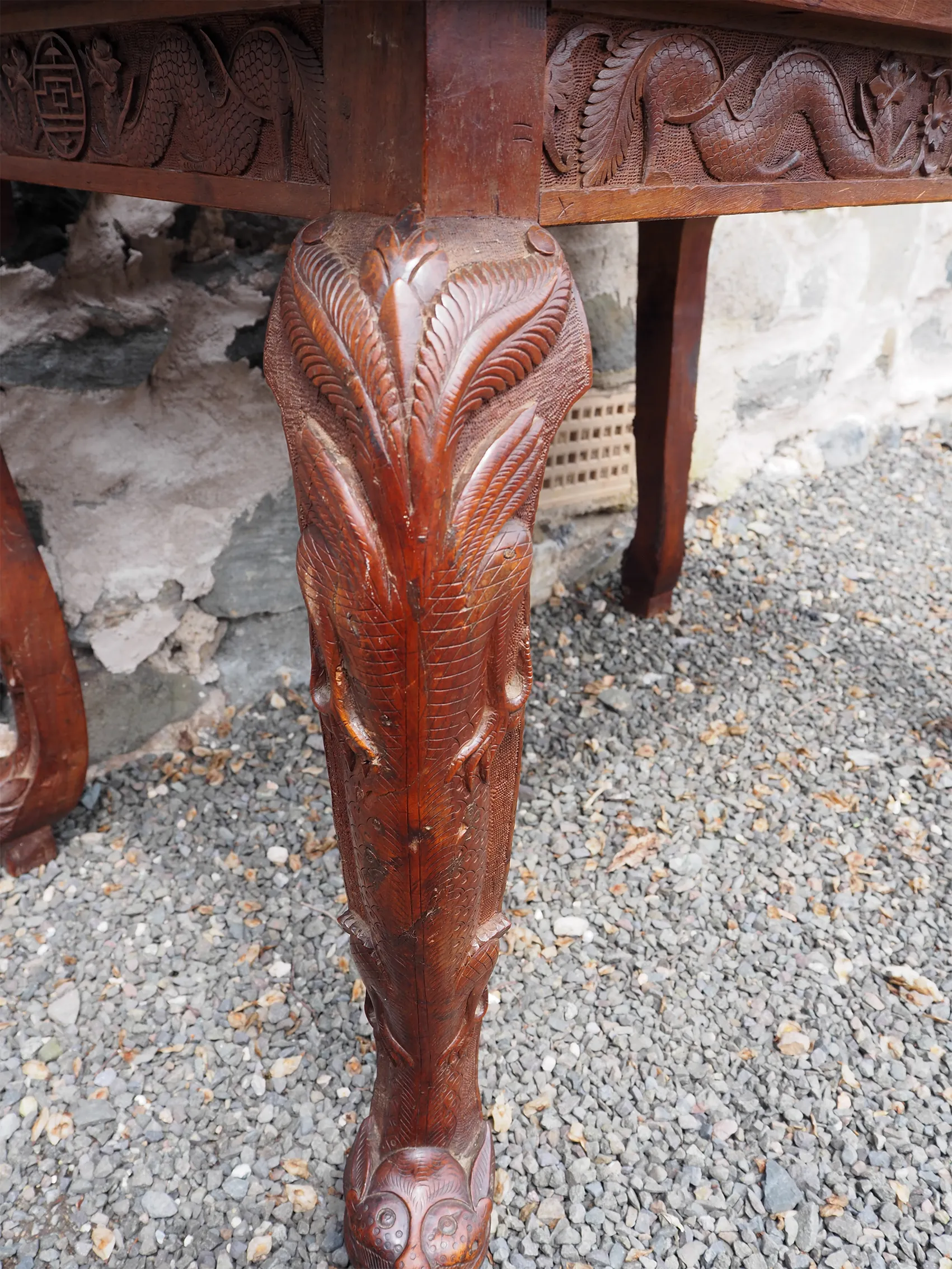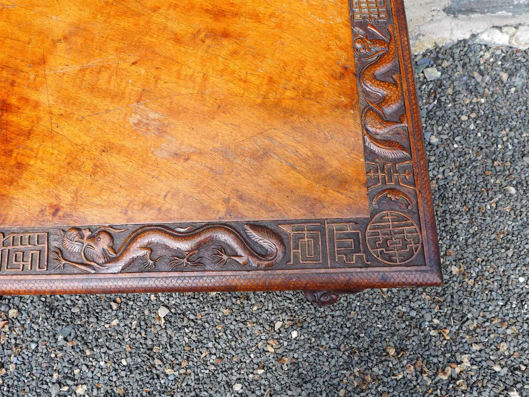 Late 19th century Chinese carved hardwood "Dragon" centre table. The base with carved and stylised square cabriole legs with carved frieze all round. The top with matching carving around the edge part. The top lifts off the base which is totally original. The colour is very good, it almost looks like walnut. Finished all round so can be free standing.