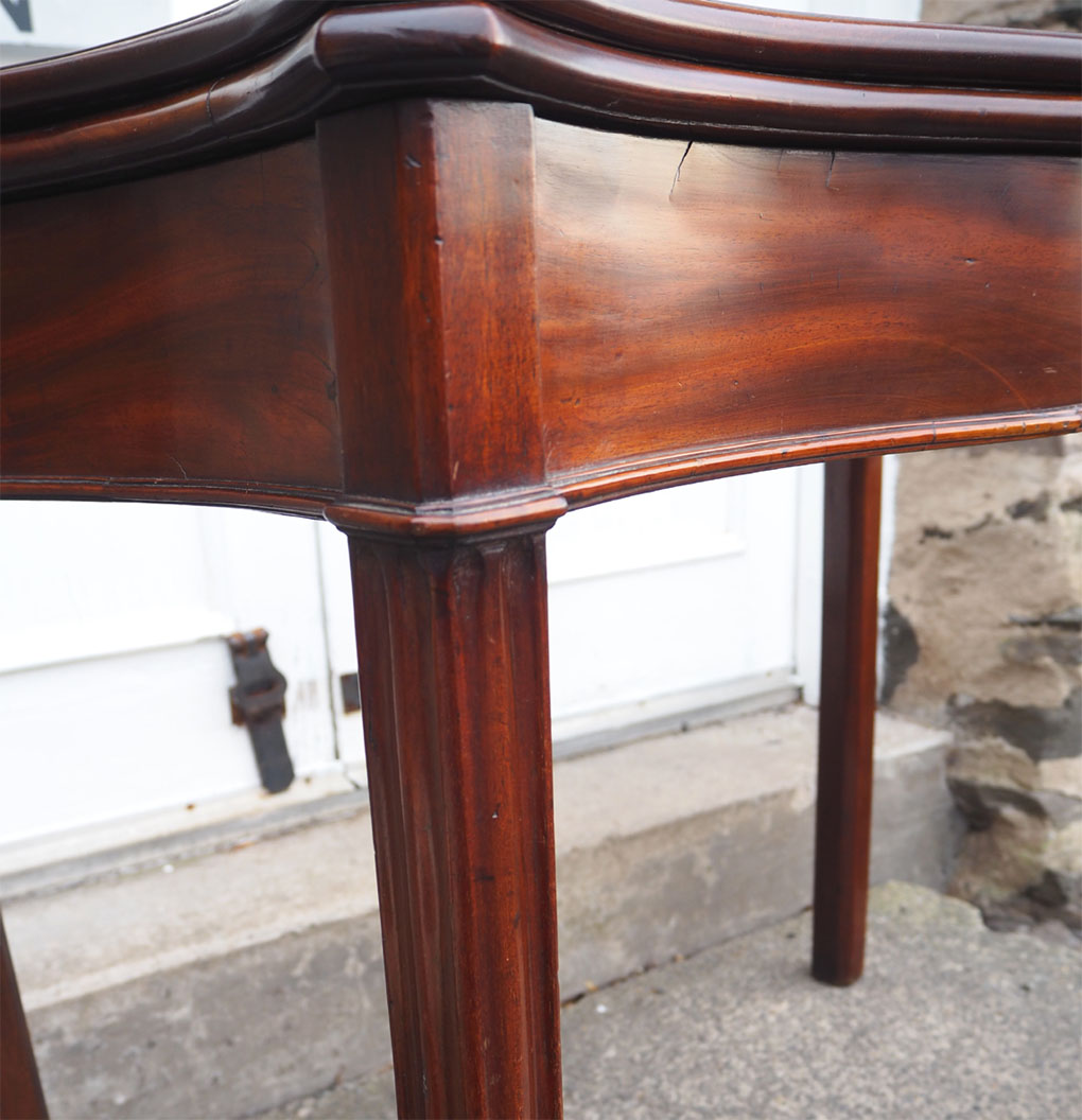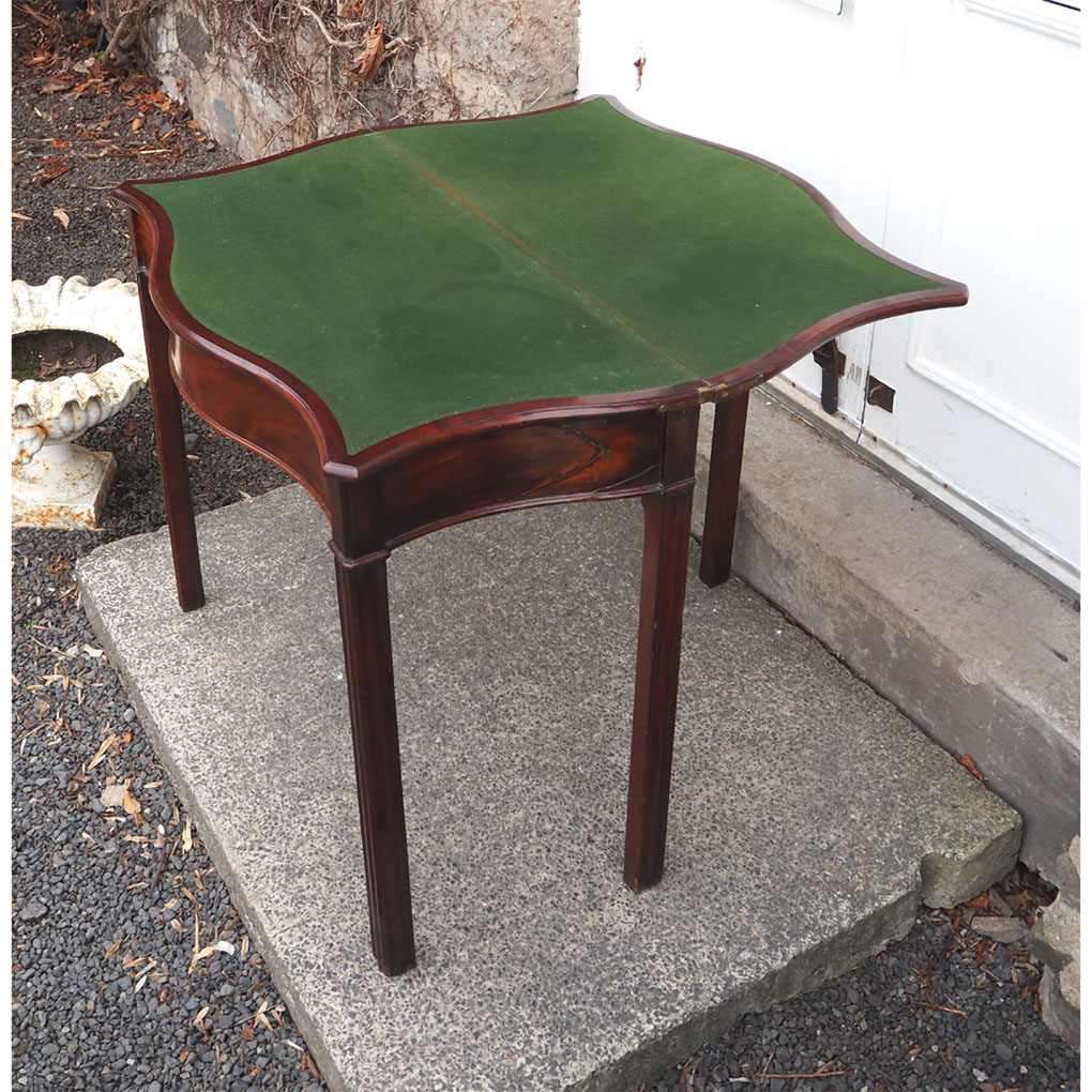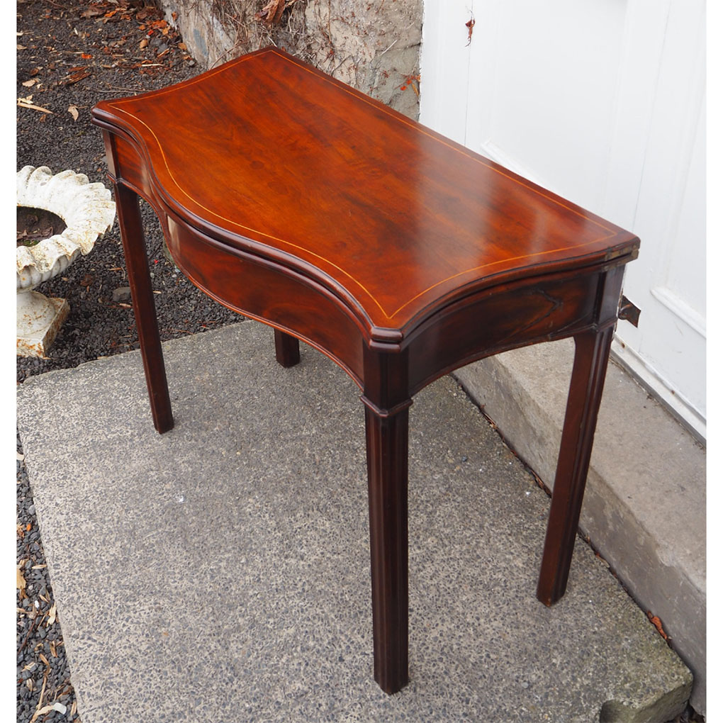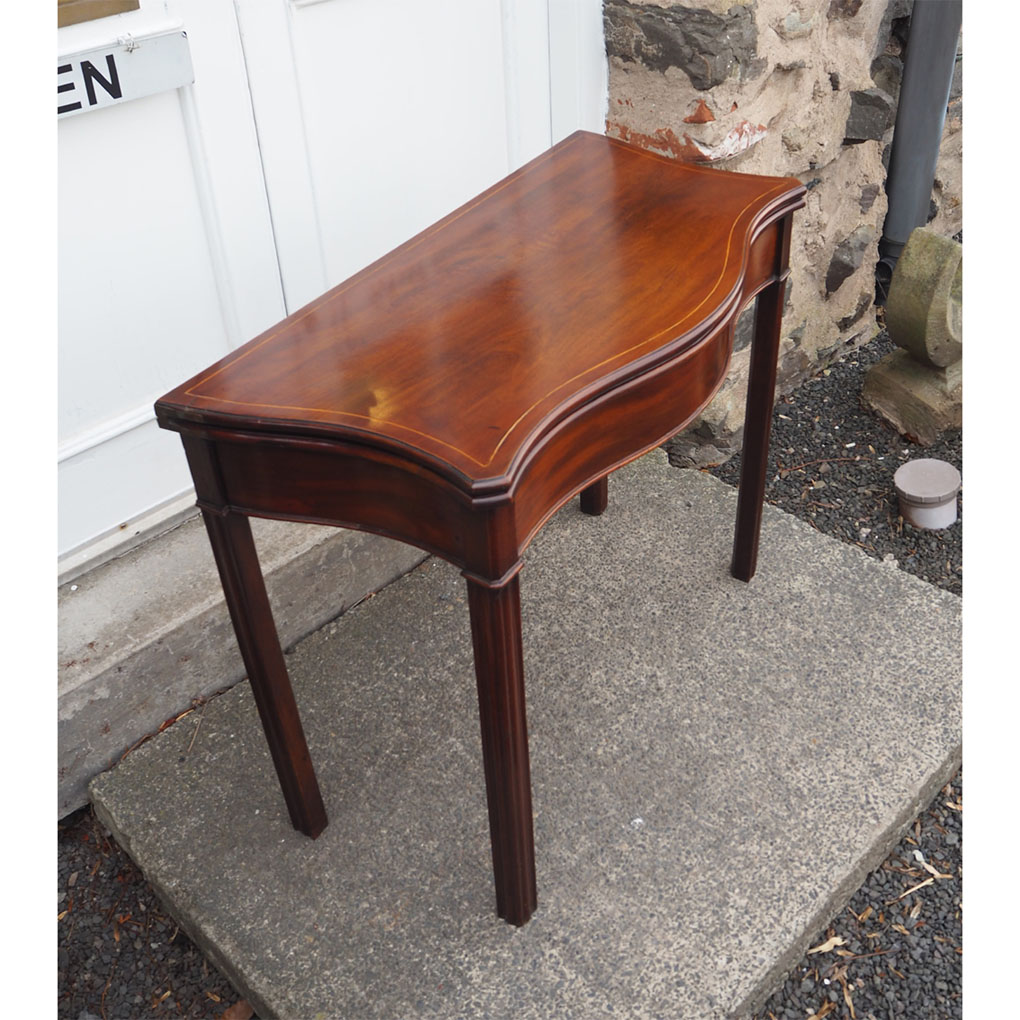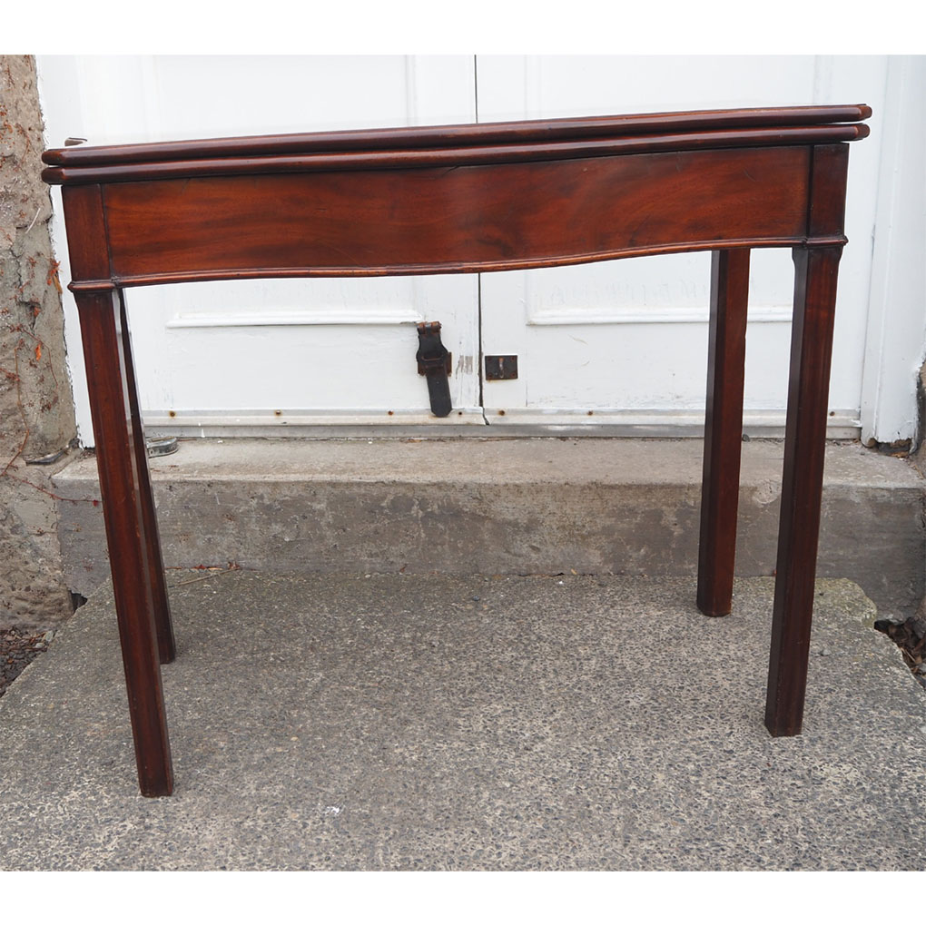 Good 18th century George III serpentine shape mahogany card table. Serpentine shaped front and sides with square moulded legs with astragal moulded decoration to the frieze. The tops with typical 18th century moulded edges with a boxwood line inlay to the top one. The inside with tooled green baize which is a nice touch.