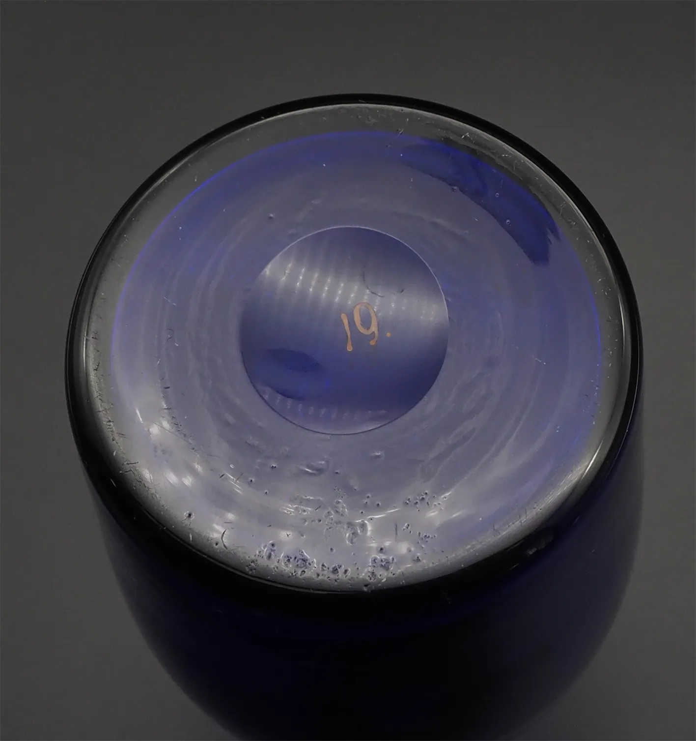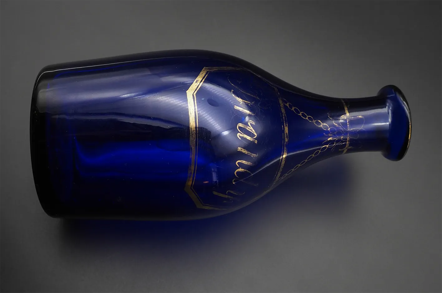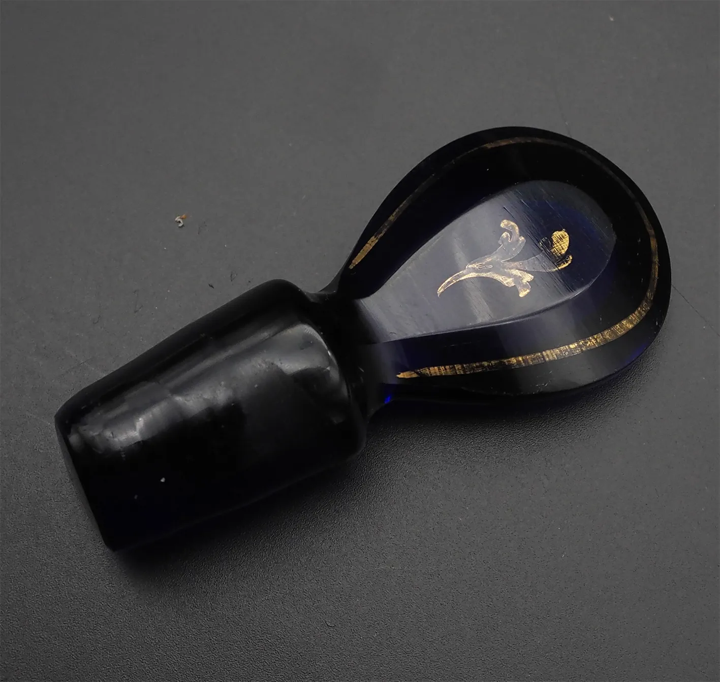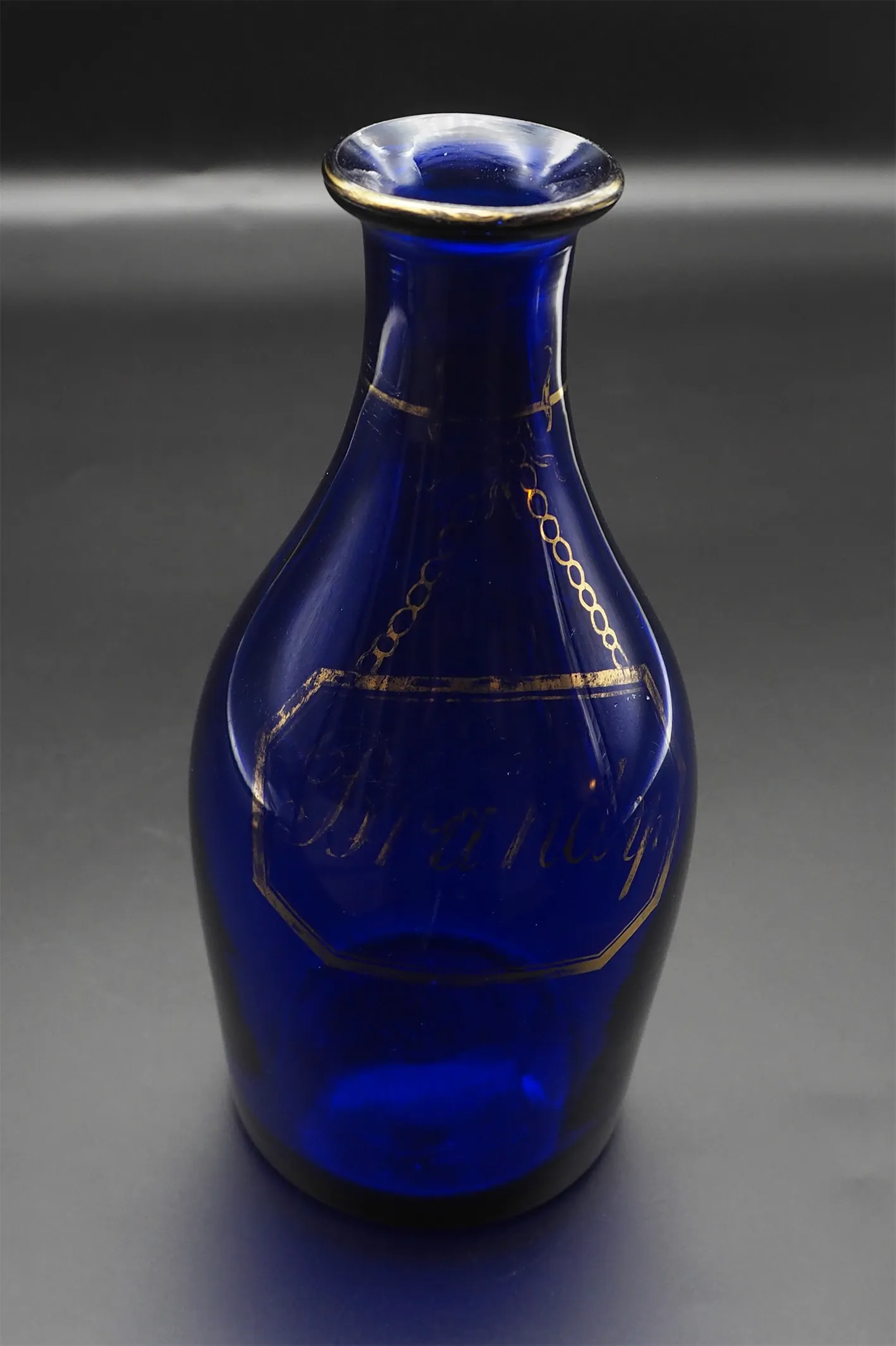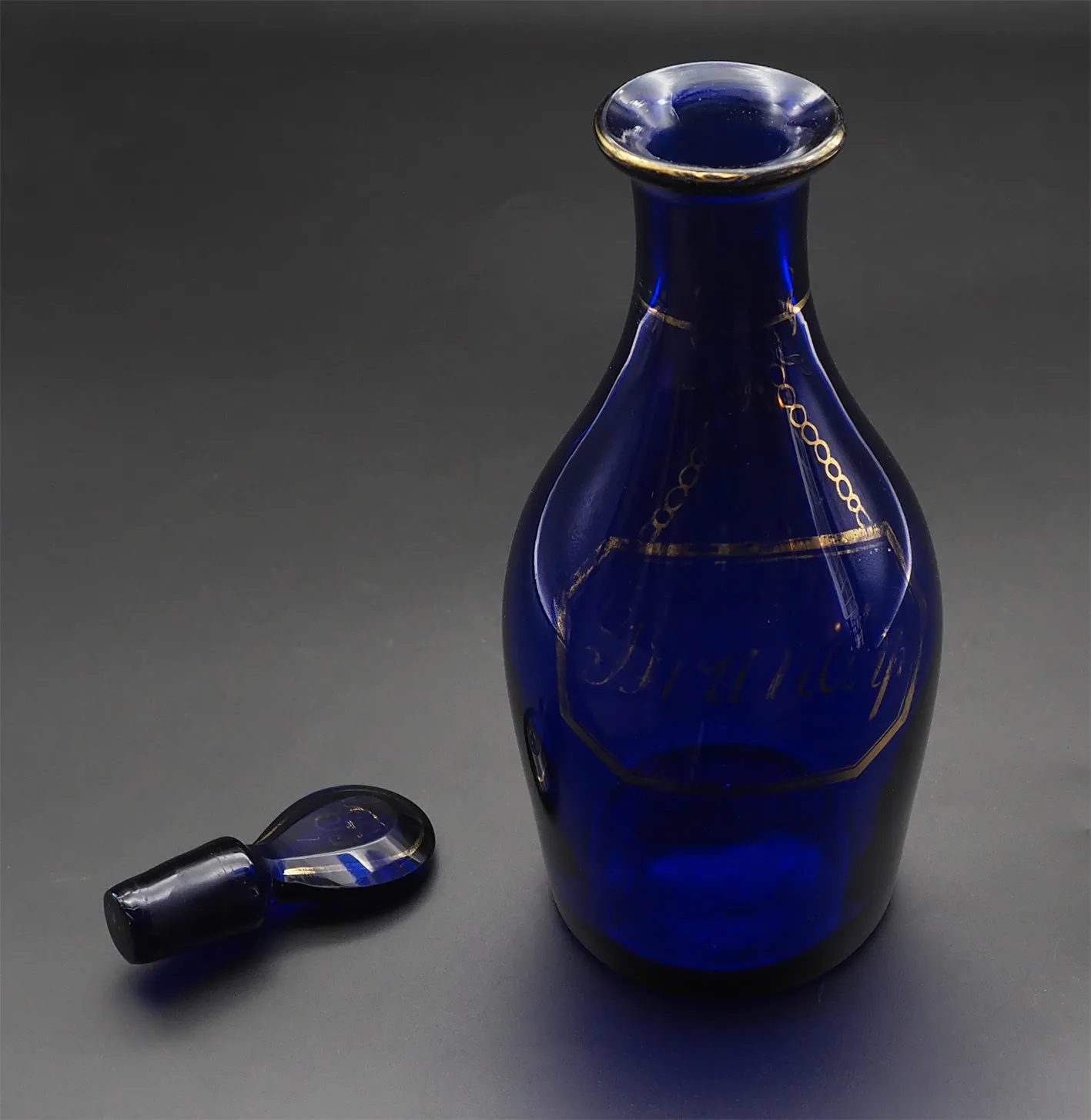 Early 19th century Georgian Bristol blue glass Brandy decanter with original gilded decoration and original shaped stopper. These are not easy to find now with their original stoppers. Some wear to the gilding otherwise very good for its age.