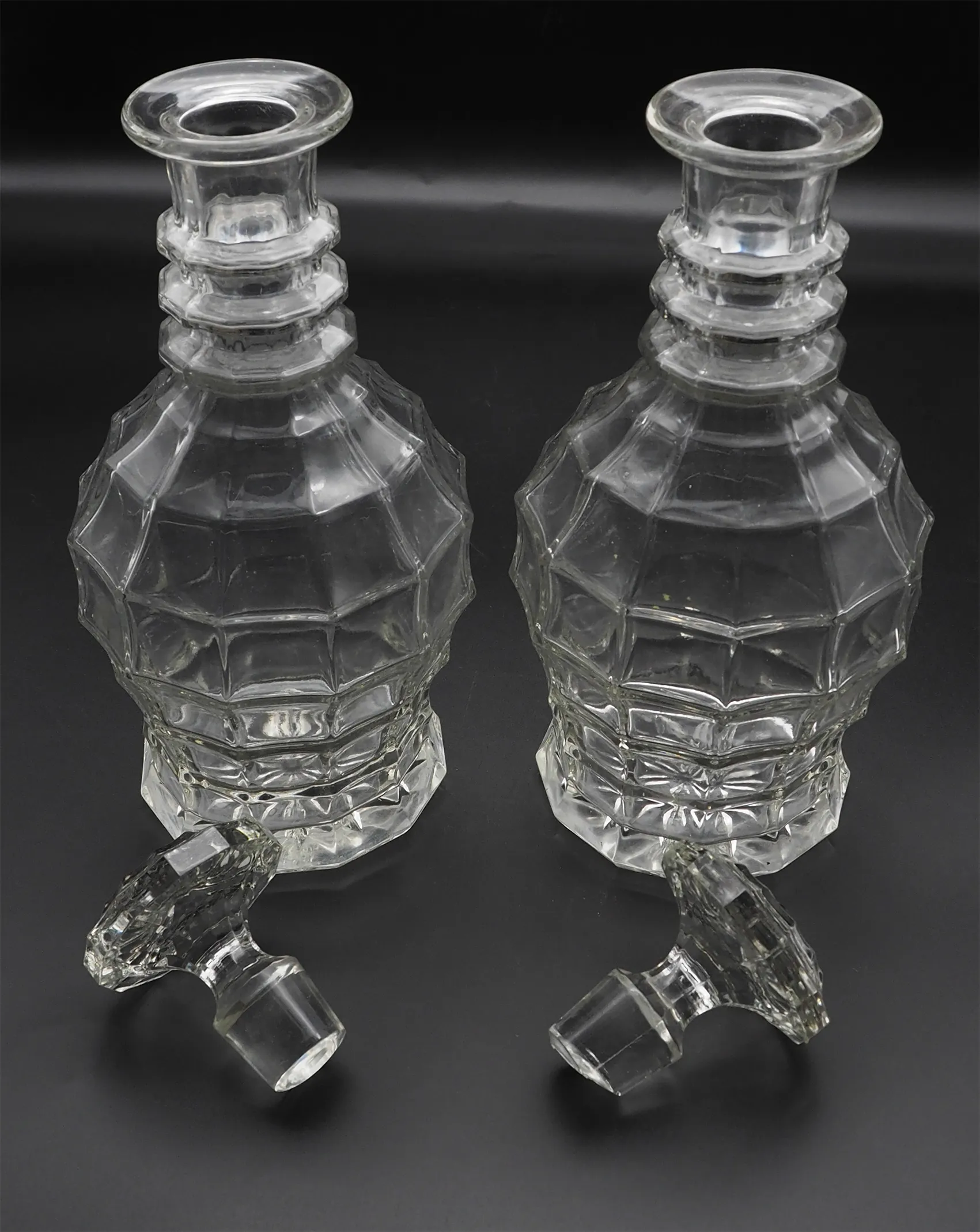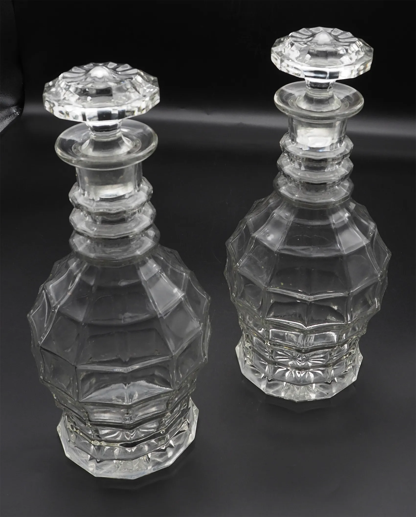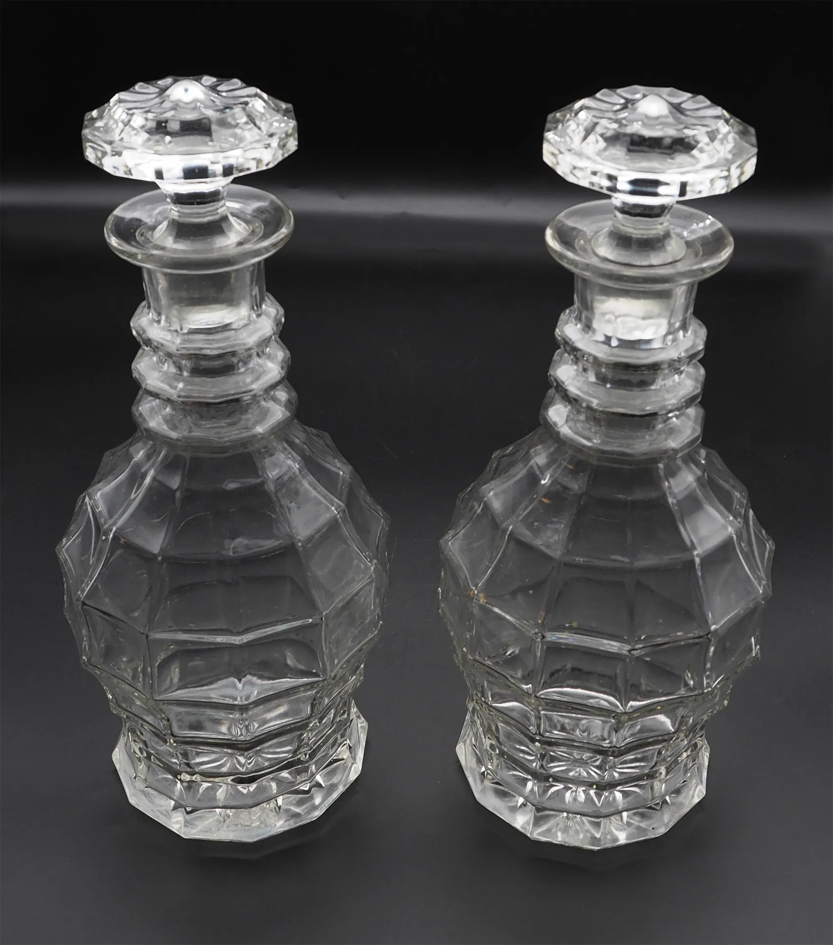 Unusual shaped pair of 19th century heavy cut glass decanters in good original condition. Both have their original cut glass stoppers. Very unusual shaped bodies with the three rings to the necks. Star cut bases.