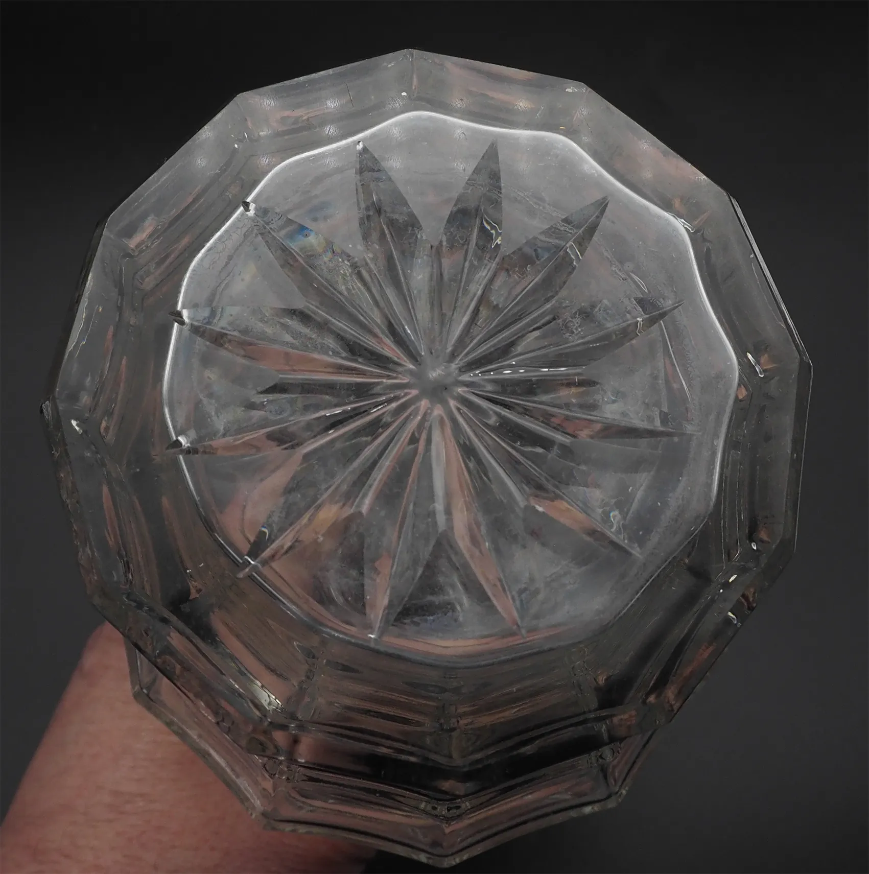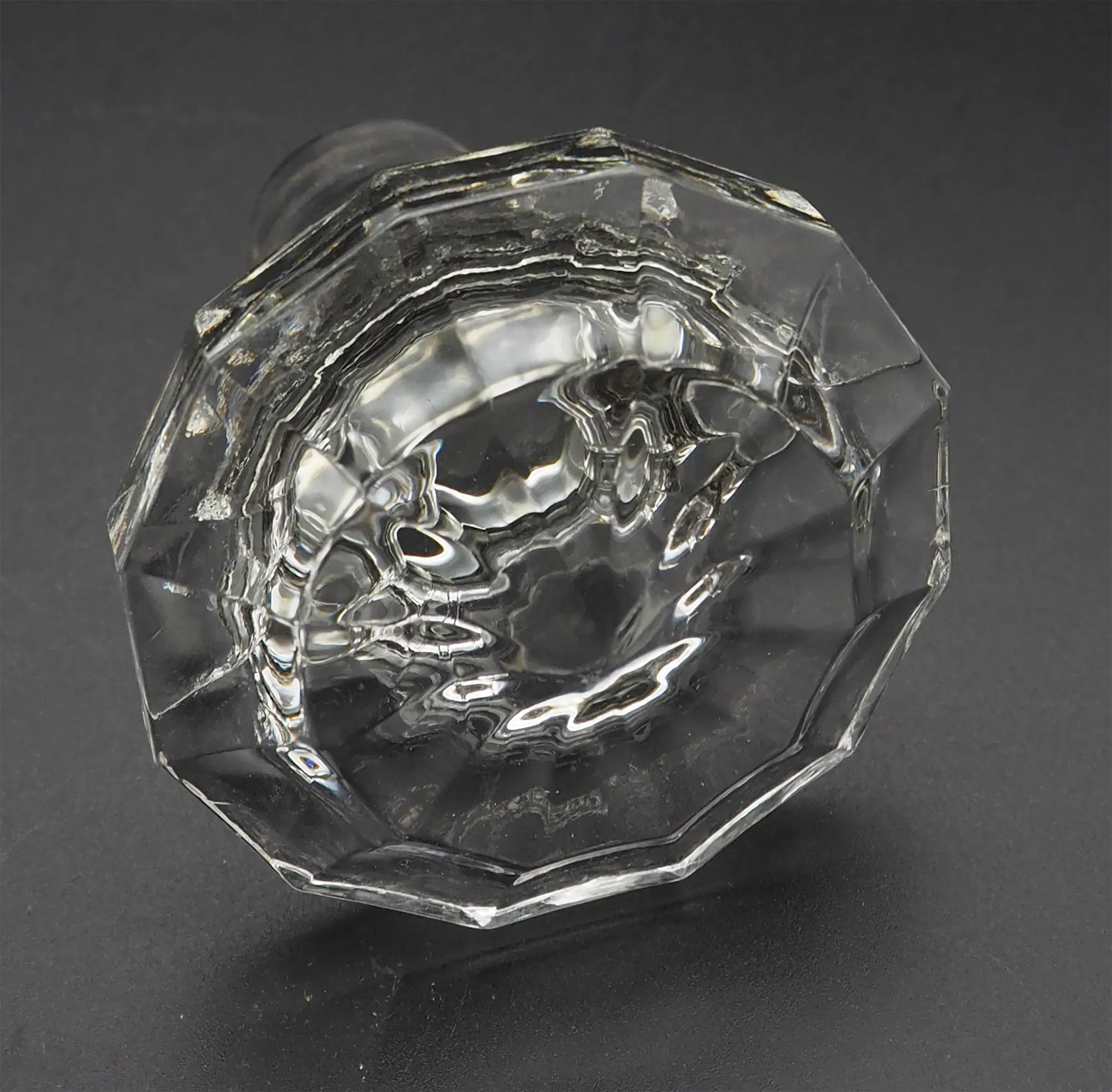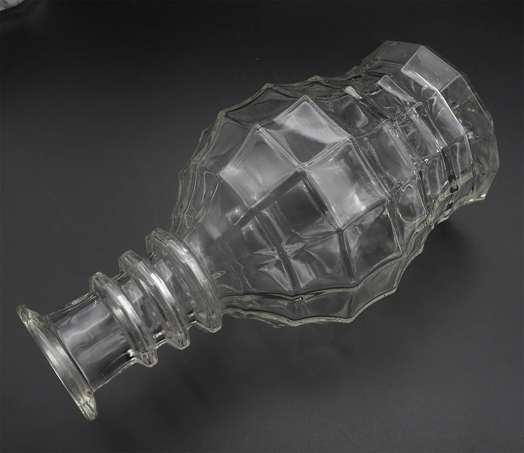 Unusual shaped pair of 19th century heavy cut glass decanters in good original condition. Both have their original cut glass stoppers. Very unusual shaped bodies with the three rings to the necks. Star cut bases.