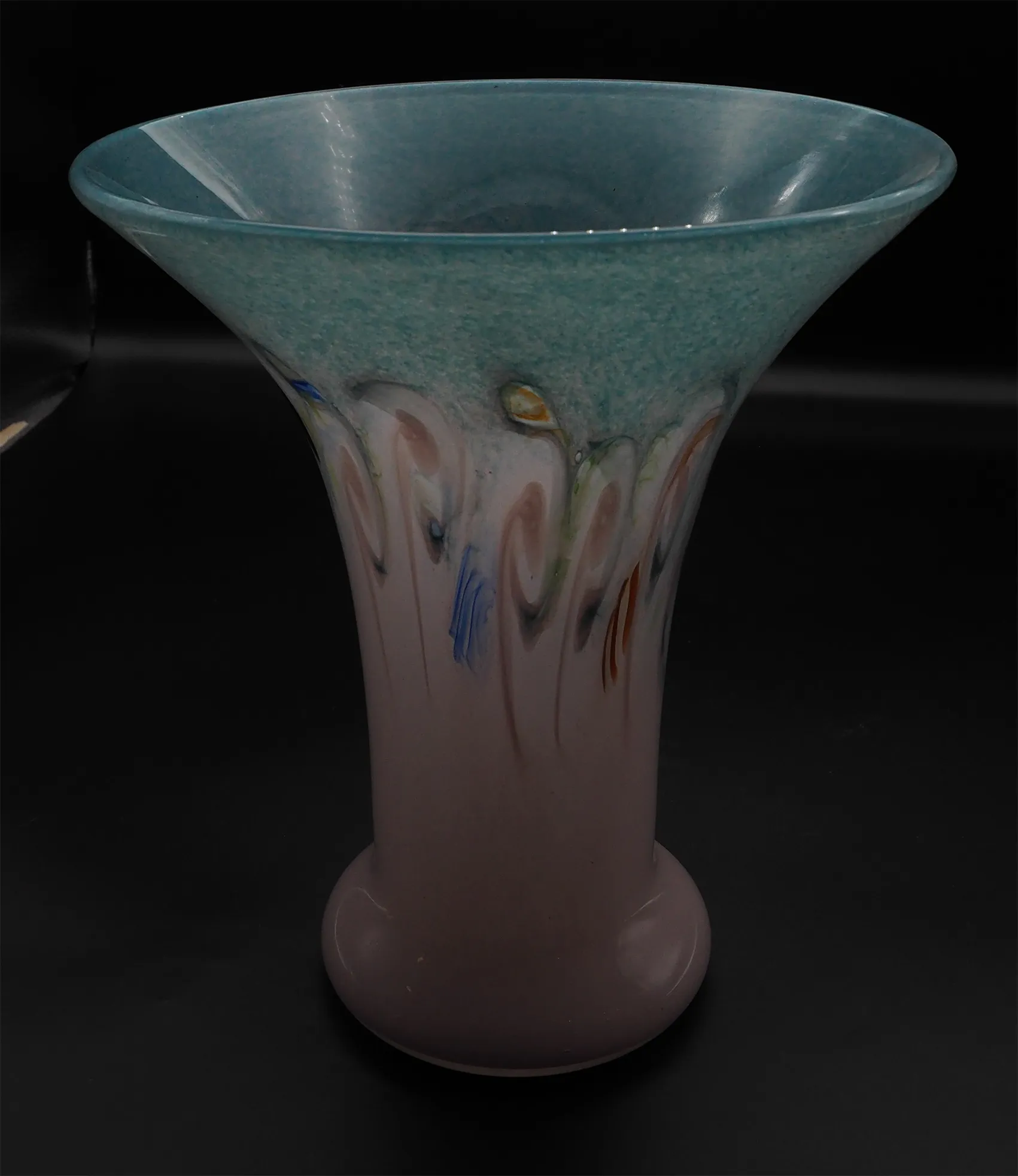 Beautiful large size Scottish Art glass tall Monart glass vase. Pink base with turquoise top and multi coloured glass decoration near the top. Perfect condition.