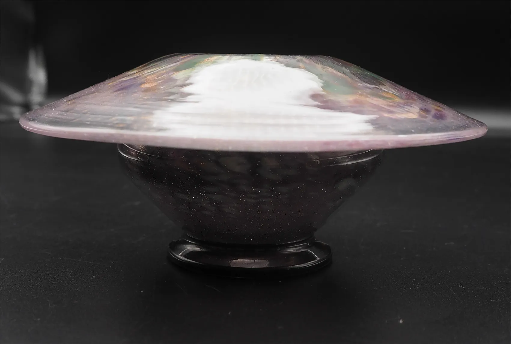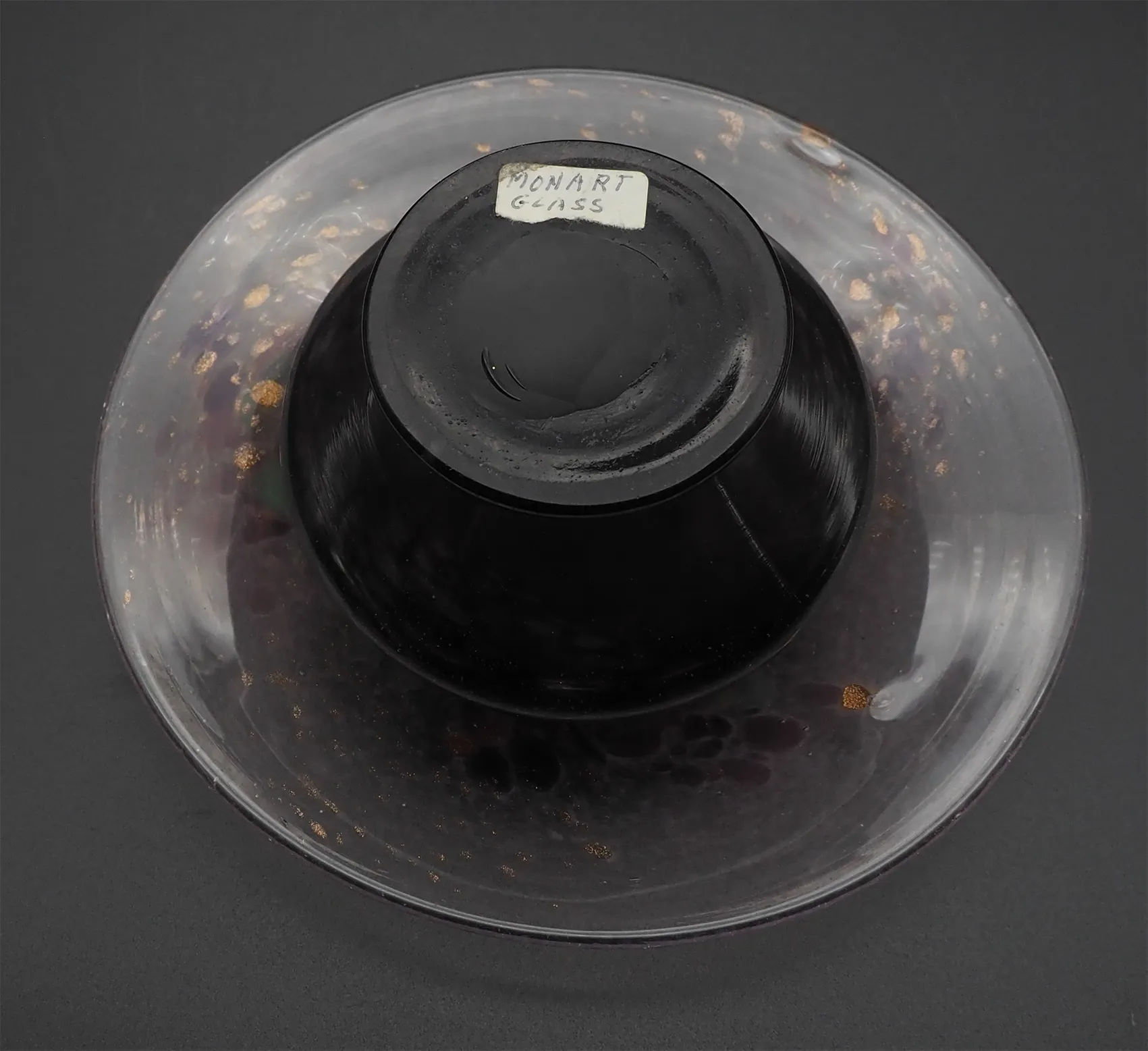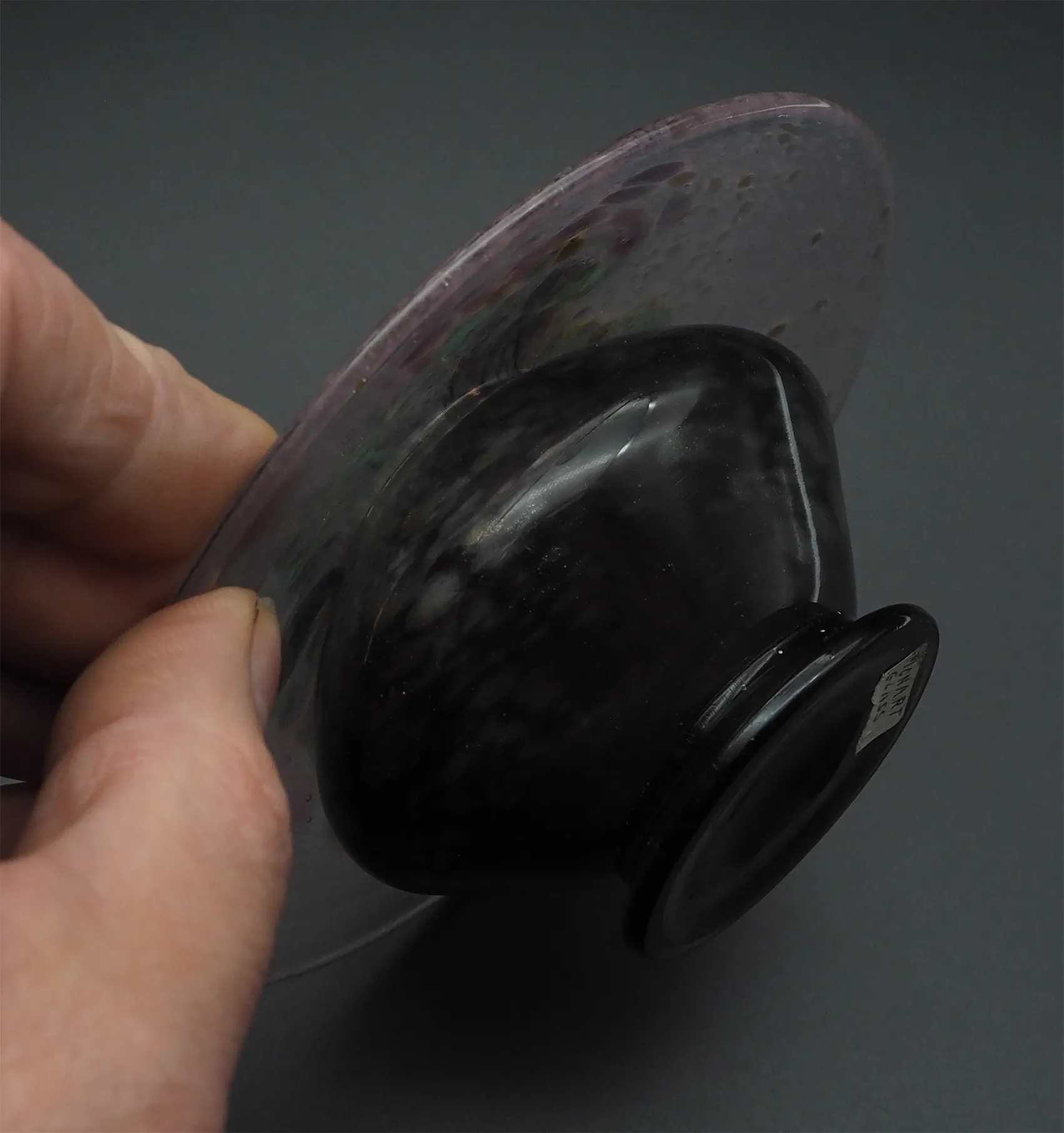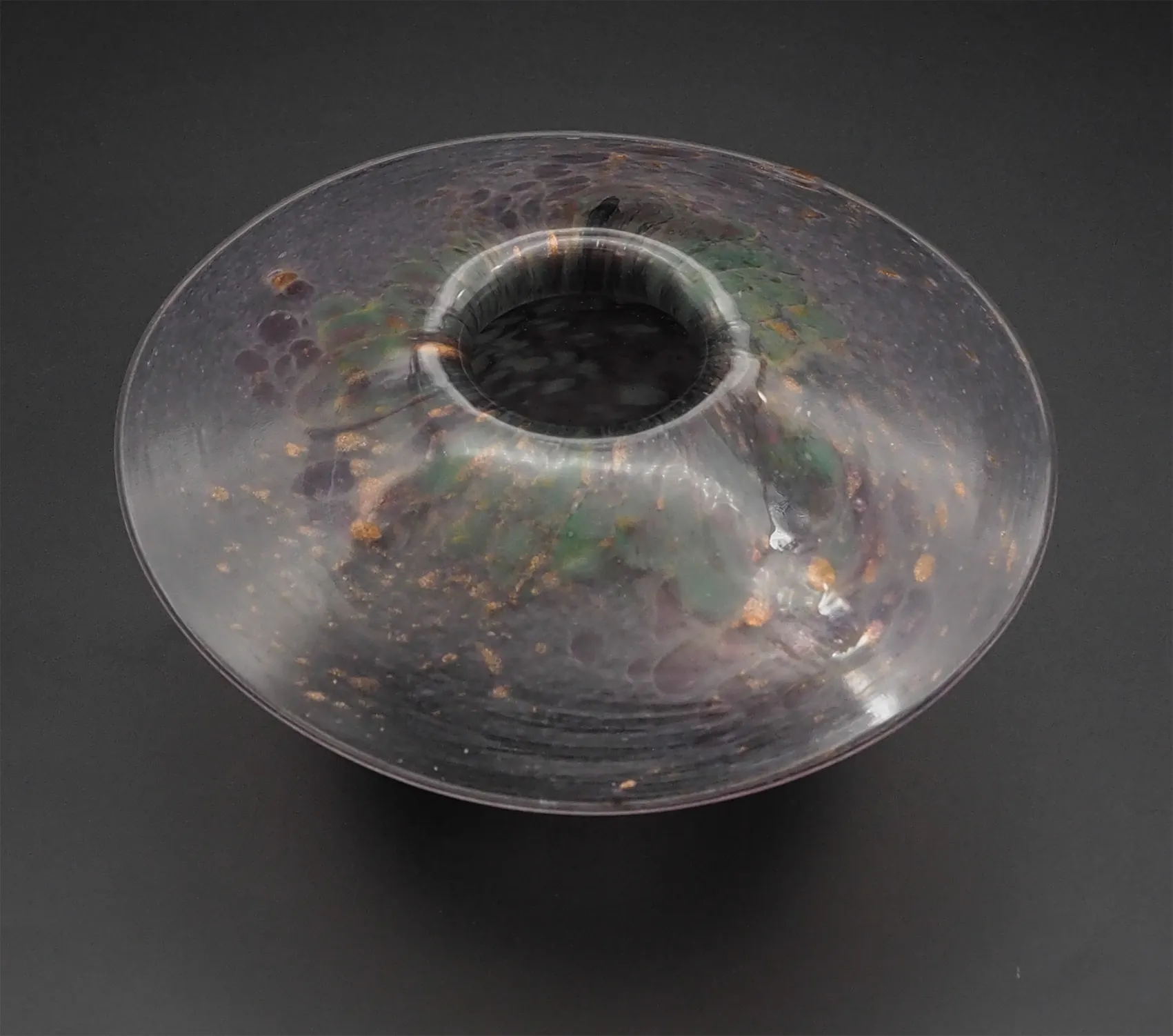 Fine & Rare Scottish art glass Monart posy vase in mainly purple and green colours with gold dust decoration. A bit like a large over-sized mushroom shape. Stunning colours. Perfect condition.