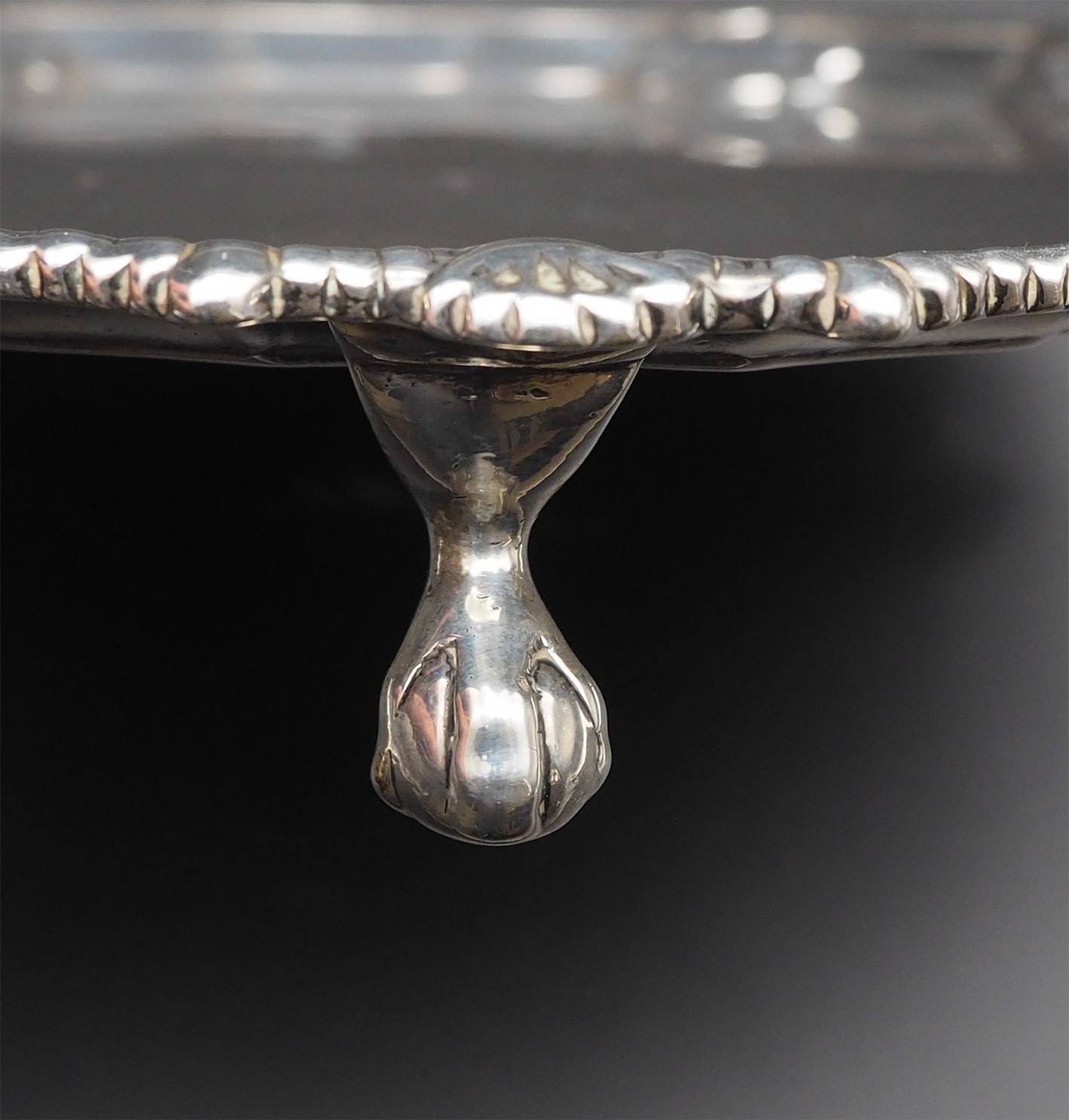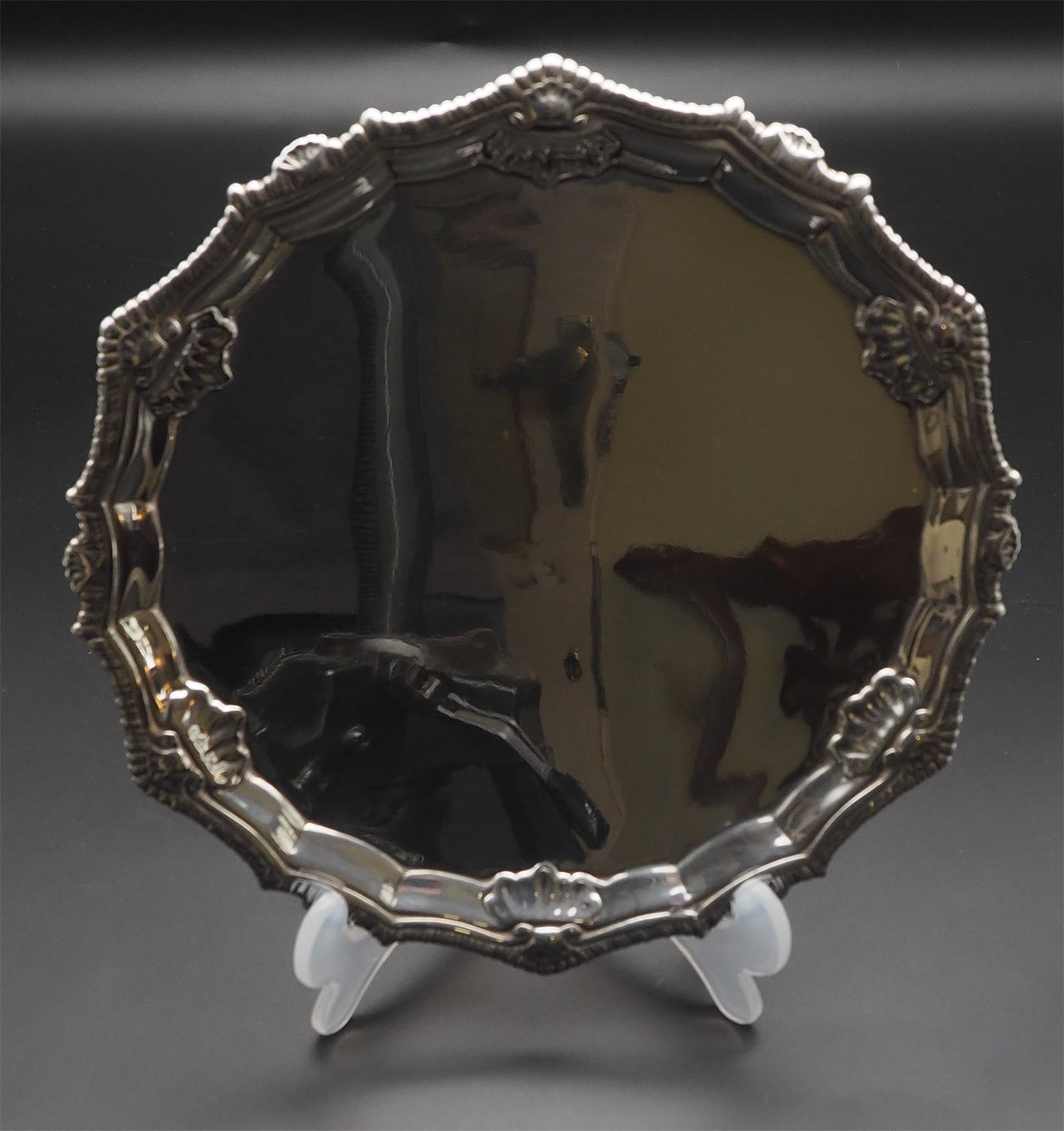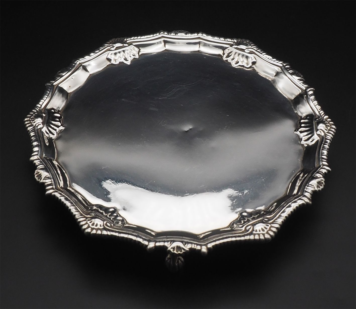 Basically very good mid 18th century 8" daimeter Sterling silver salvour by EBENEZER COKER of LONDON. Lovely shape with gadrooned edge with shell type decoration. Nice shape small claw and ball feet. The condition is very good apart from a tiny dent near the middle of the tray.