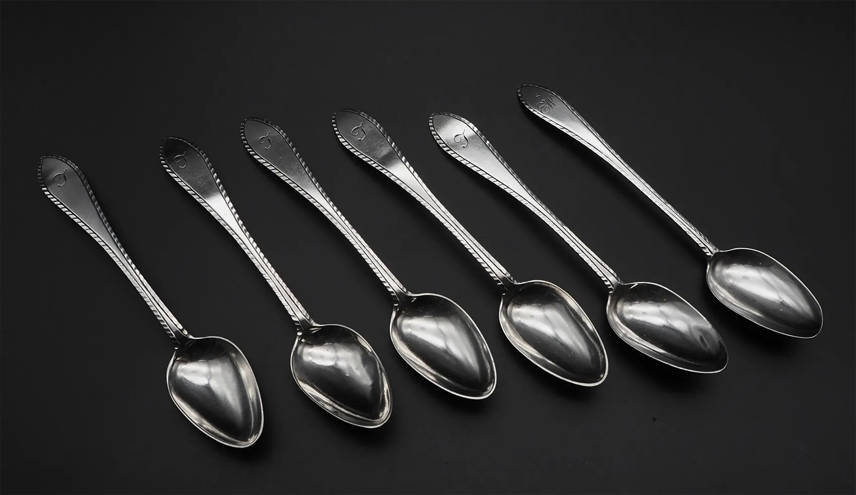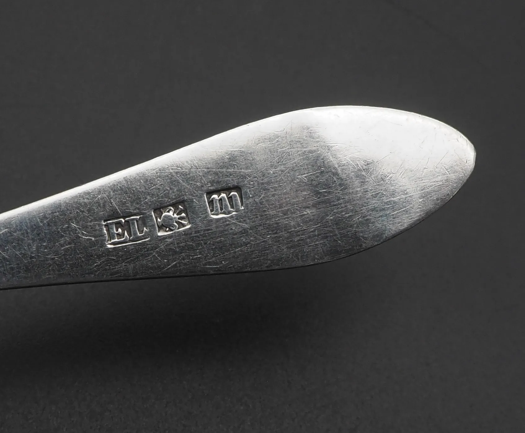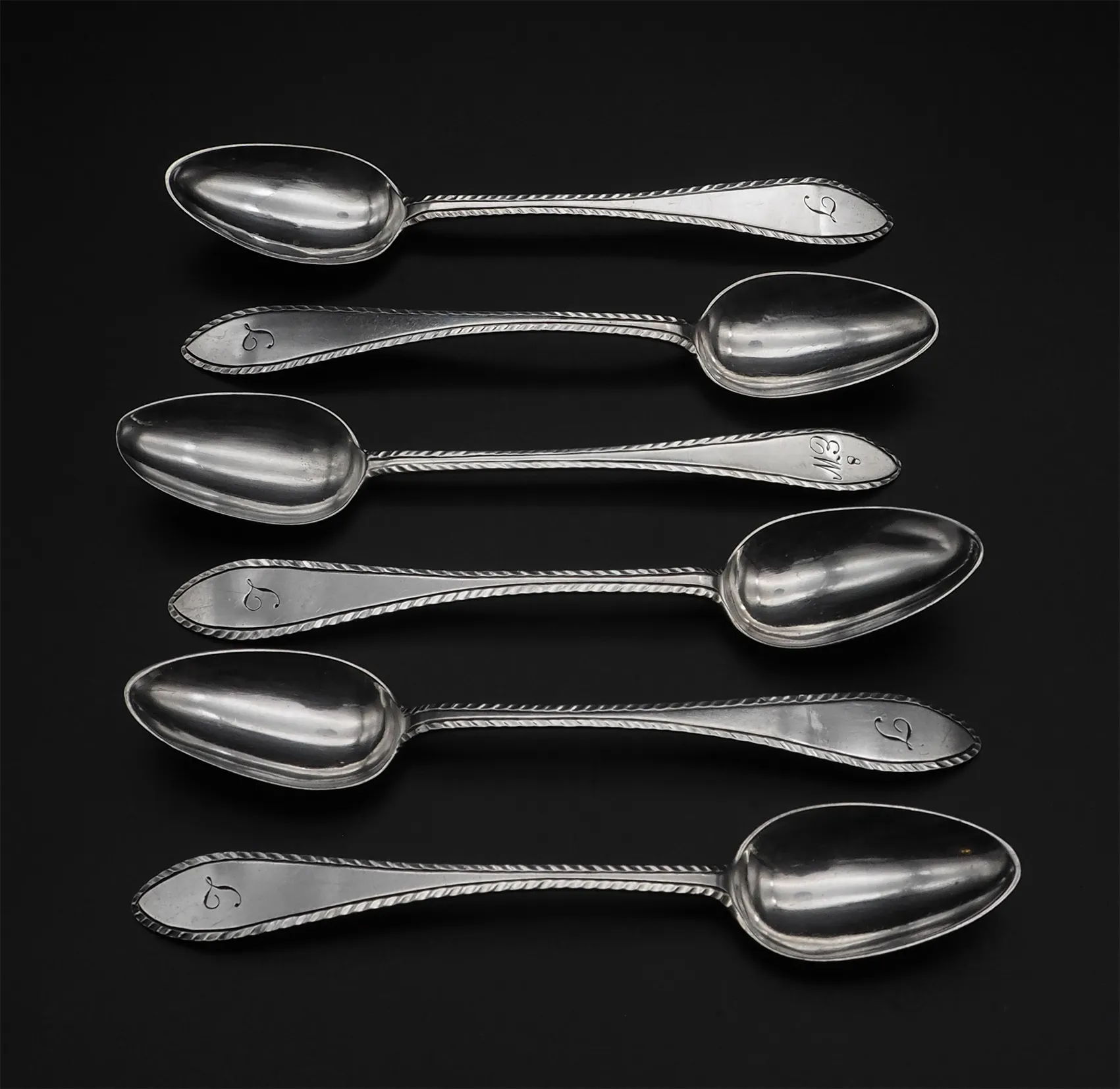 Set of 6 early 19th century Scottish provincial silver teaspoons by EDWARD LIVINGSTONE of DUNDEE. Nicely decorated handles. Pretty decent overall condition. One has slightly different marks. Dundee hallmarks.