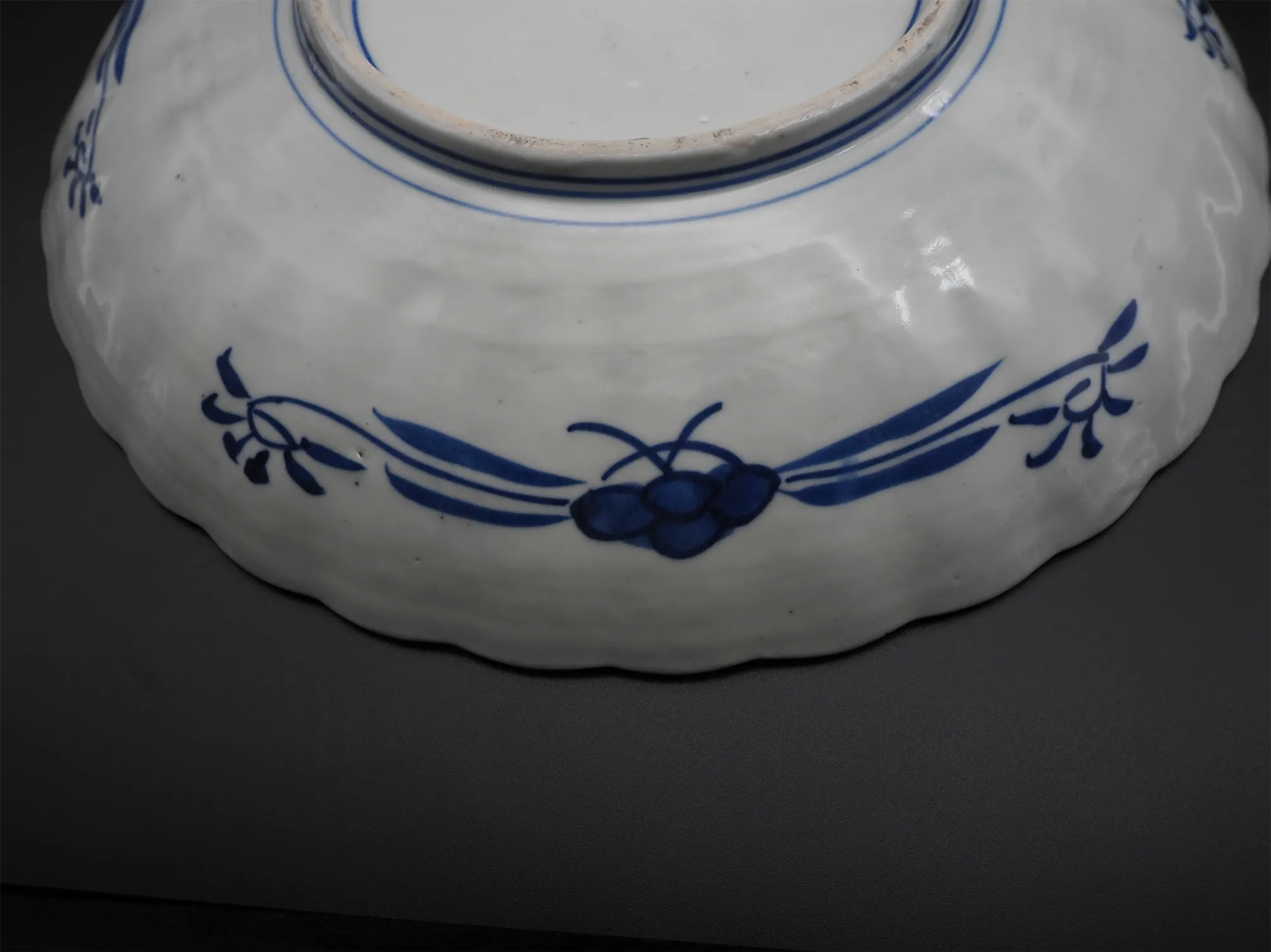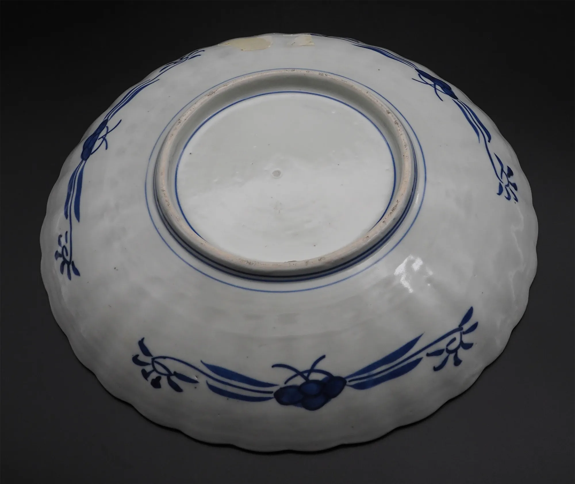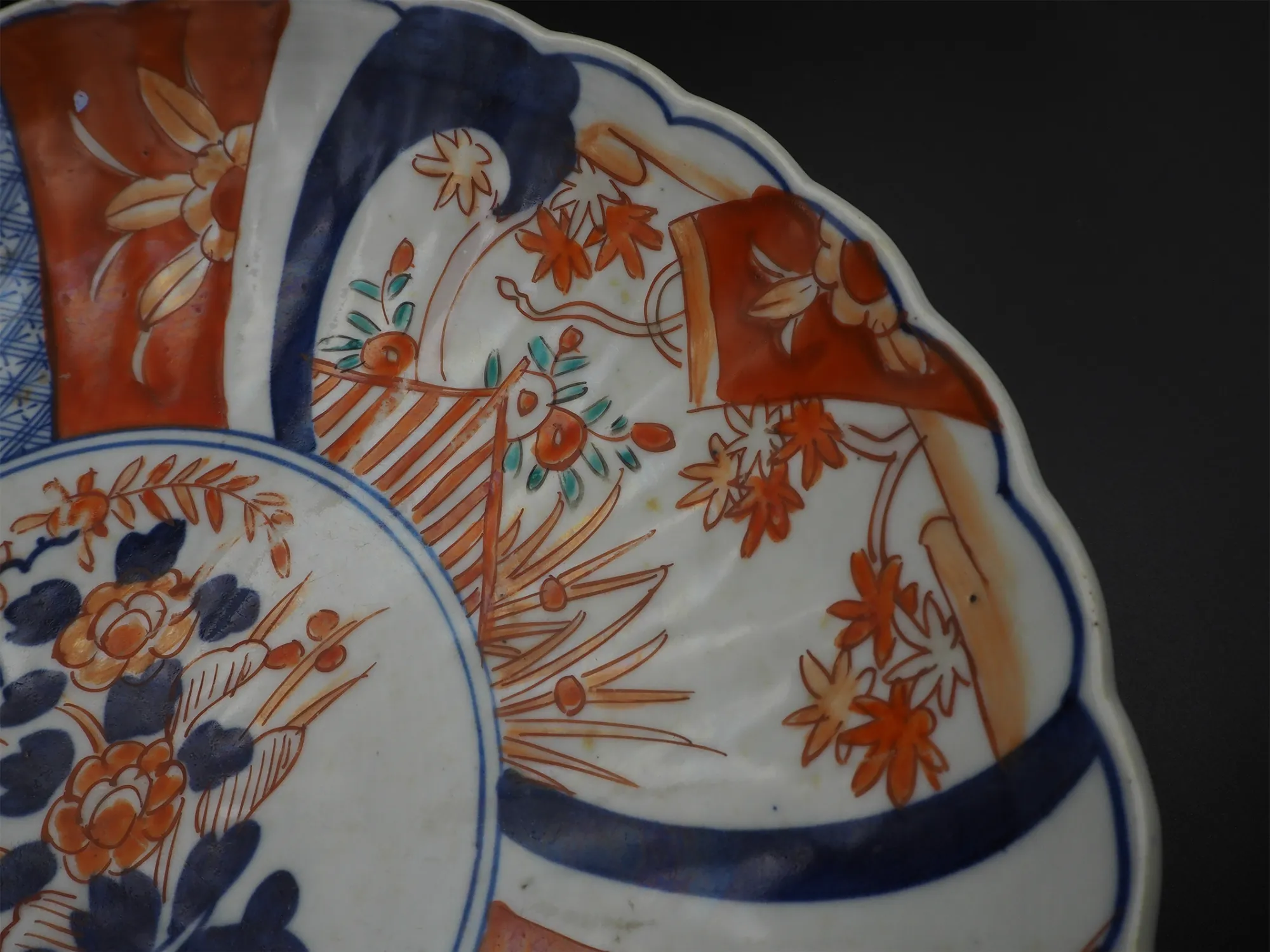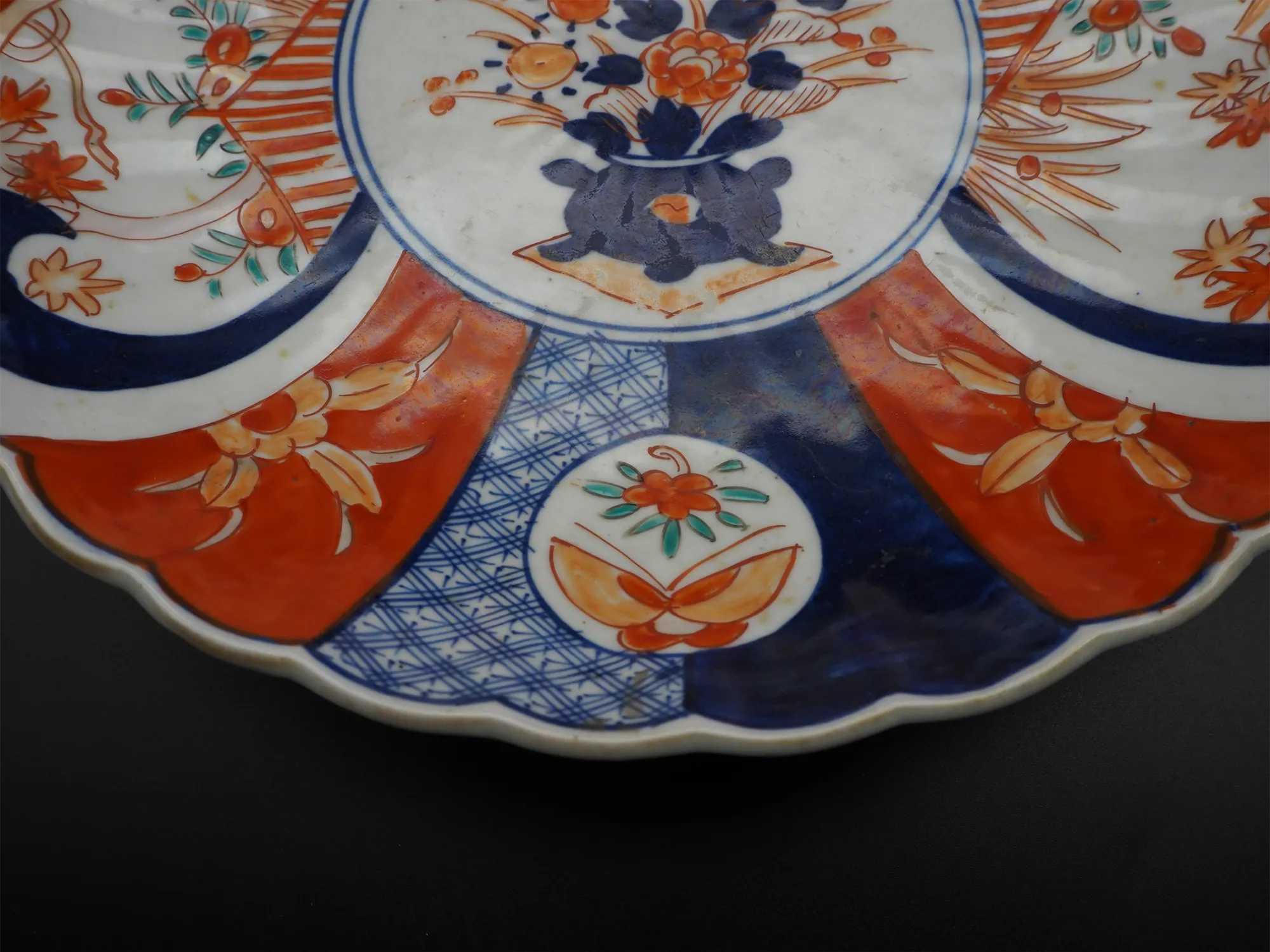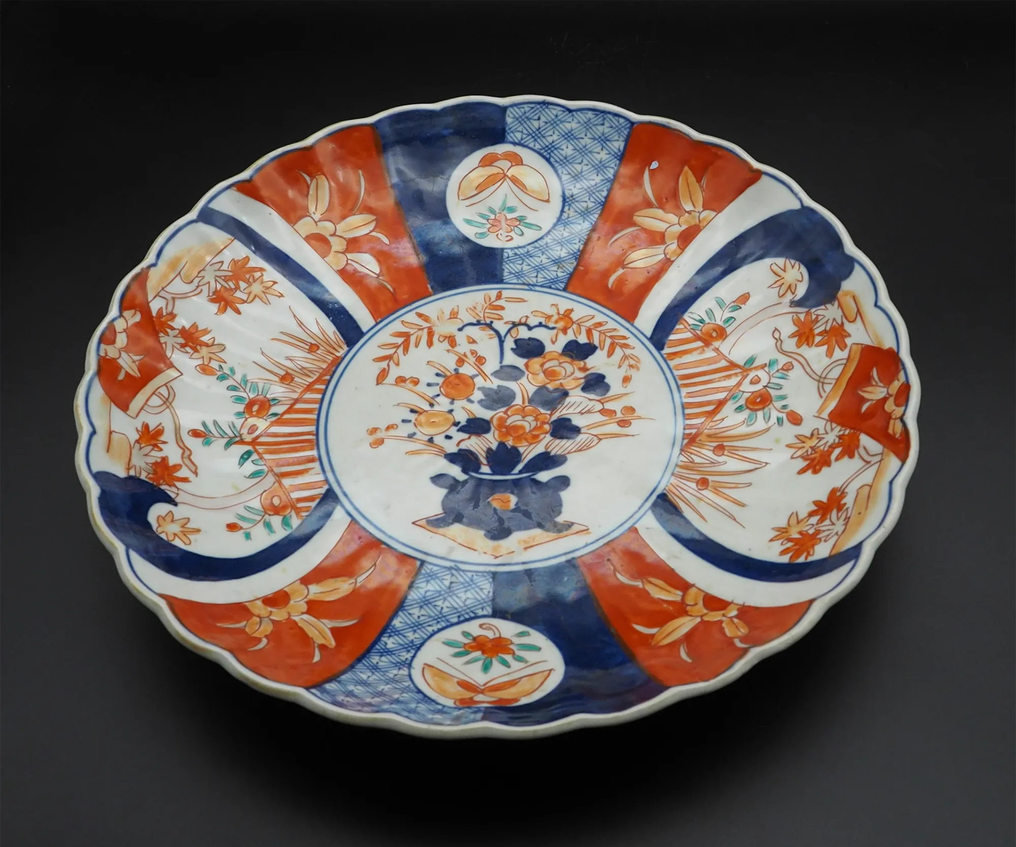 Good clean 19th century Japanese Imari charger of scalloped shape with typical red and blue painted decoration. Has a vase of flowers in the middle surrounded by various plant and garden scenes. Decorated on the black also with stylised blue flower type designs