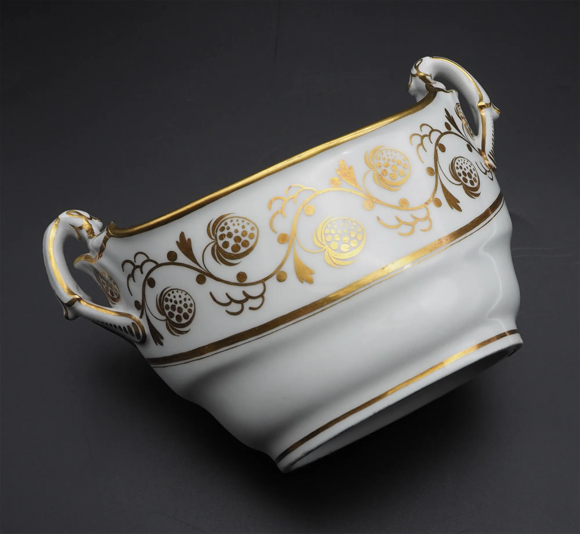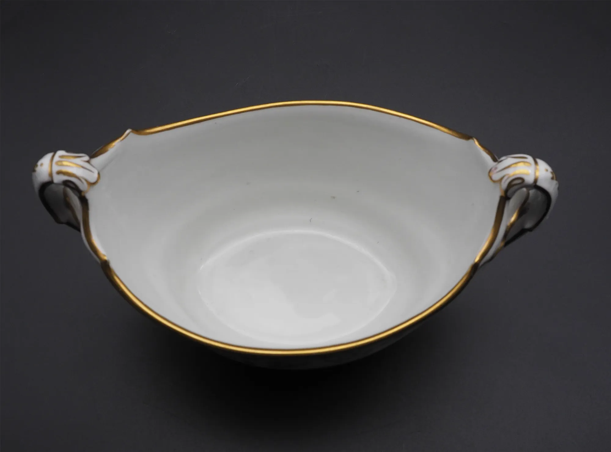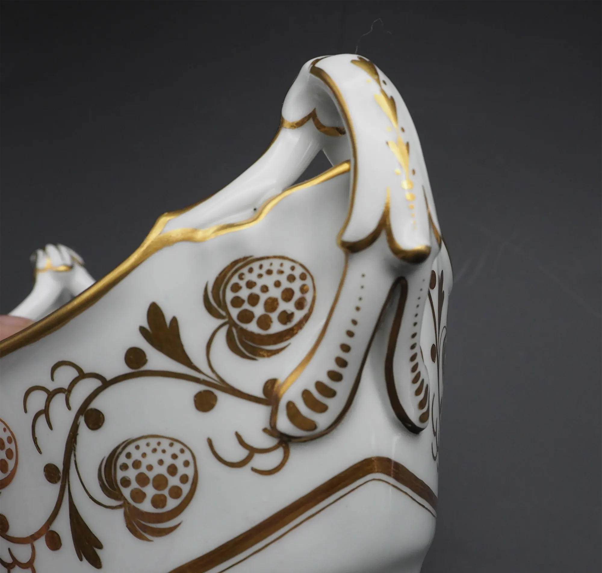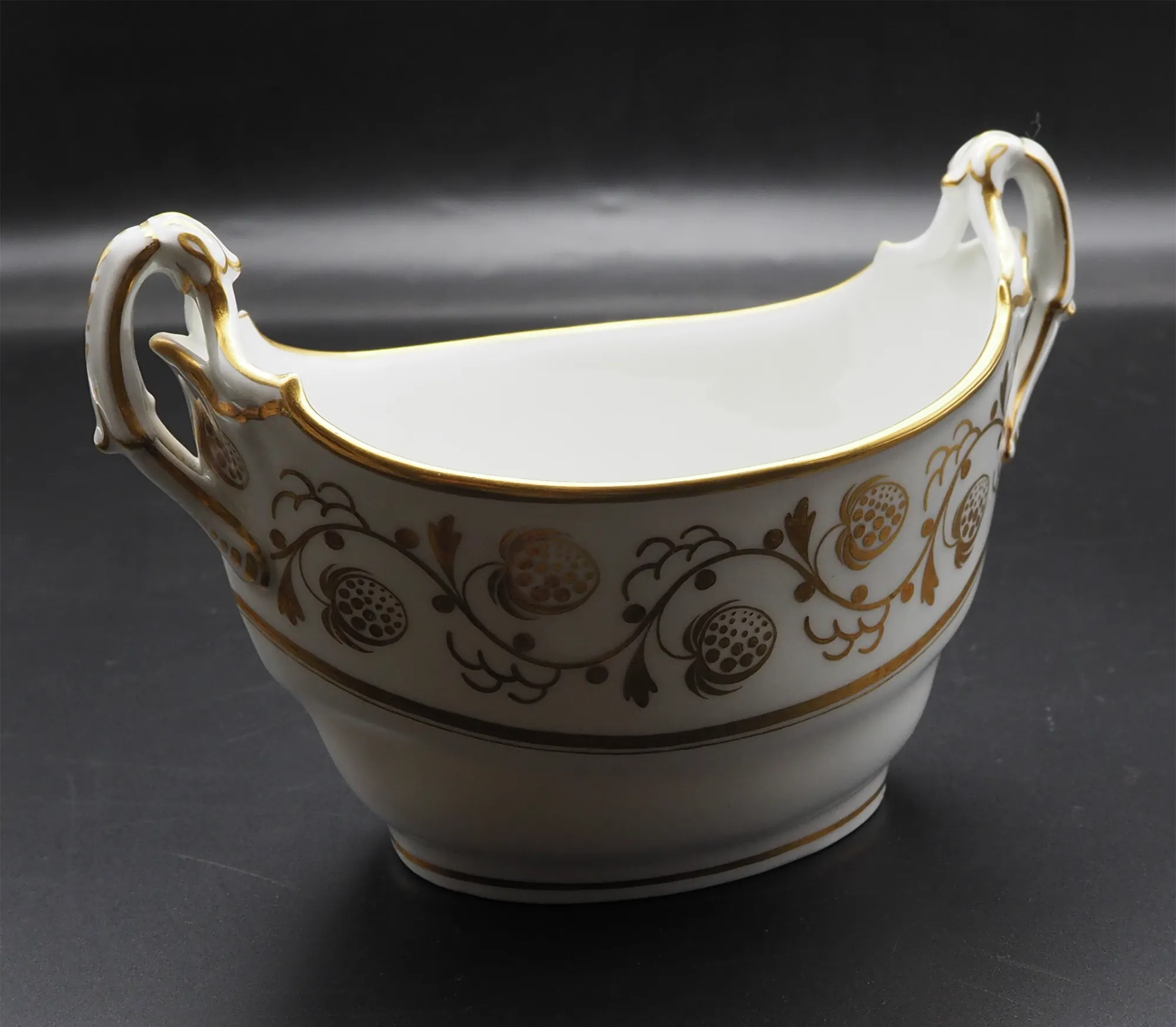 Good early 19th century English porcelain boat-shaped open sugar bowl with lovely shape scroll handles. Nice gilt decorartion with no rubbing. Feint mark to the base for early Derby. Good condition with no damage, cracks or repairs.
