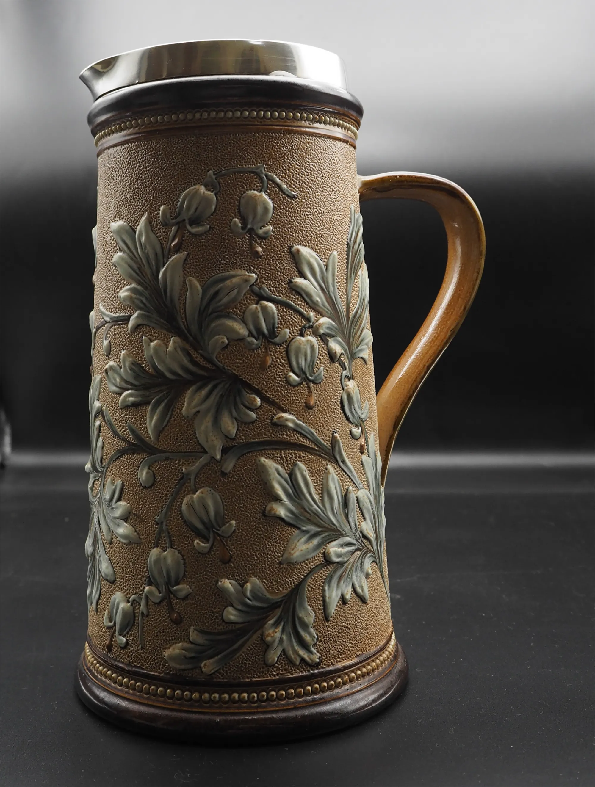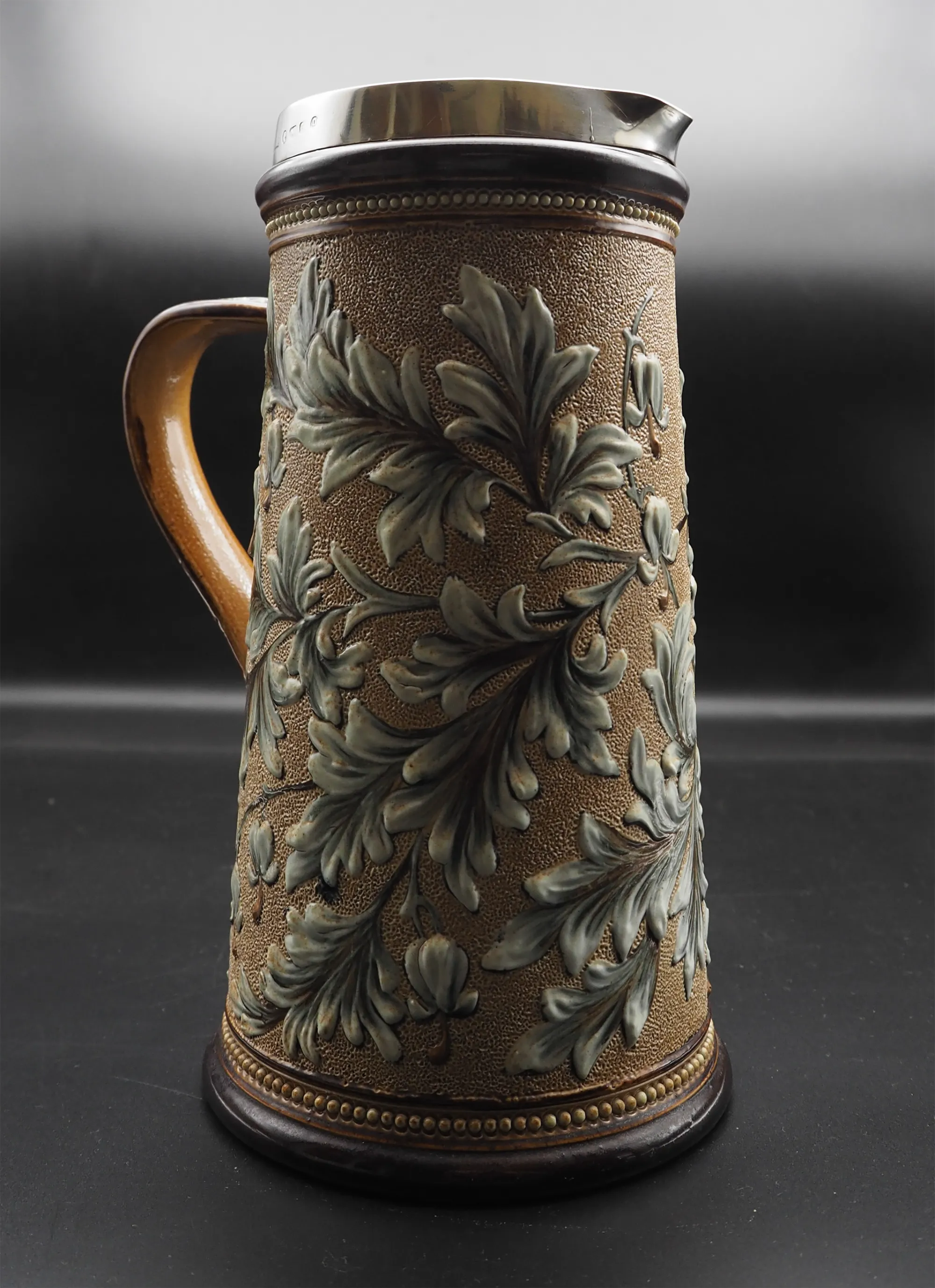Good Victorian Royal Doulton, Lambeth silver topped earthenware lemonade jug. The jug is fully marked and dated to the base, 1881 with the initials for Eliza S. Banks. The silver rim is hallmarked for Birmingham 1881. Good condition with no damage. Nice design.