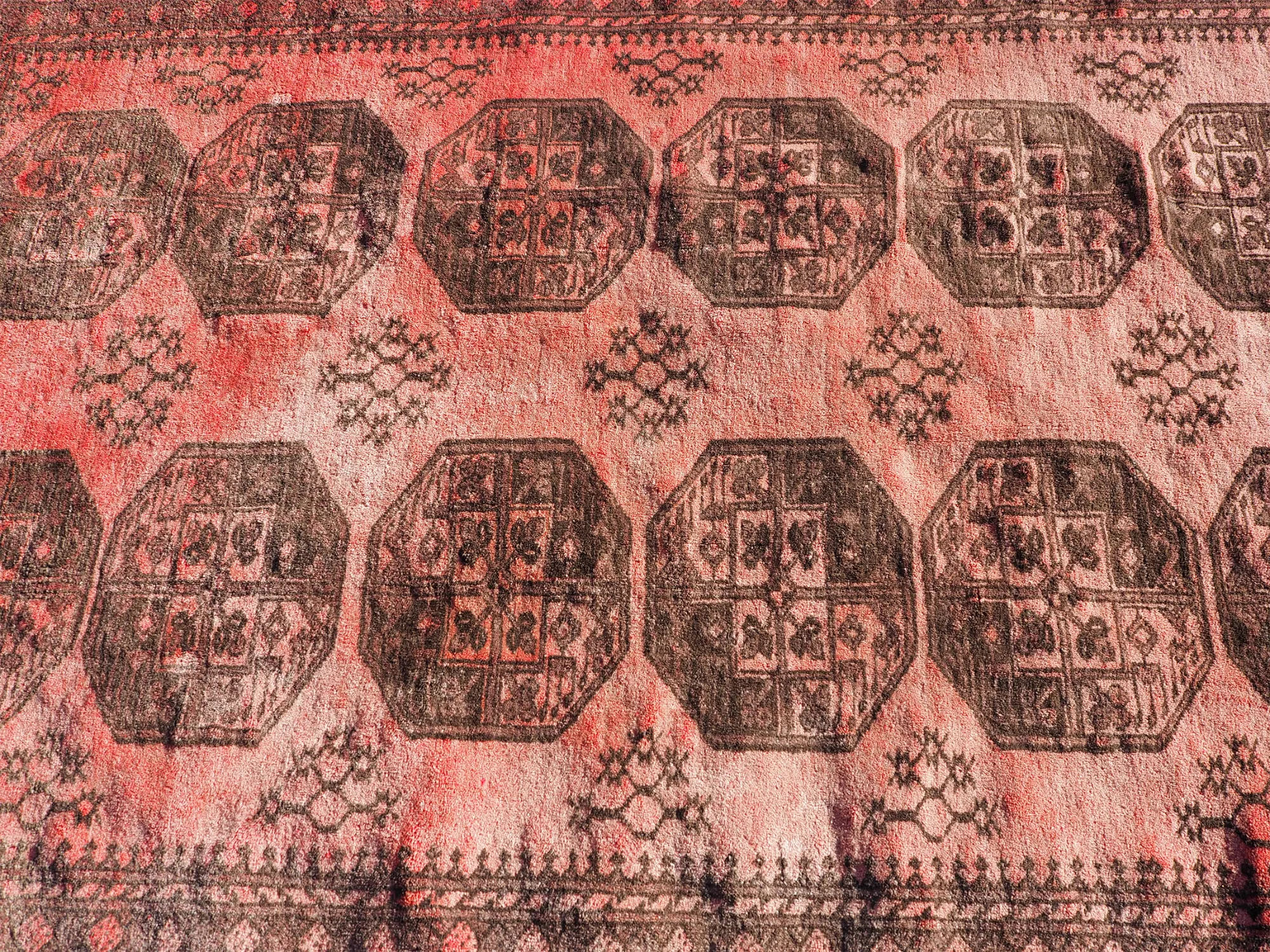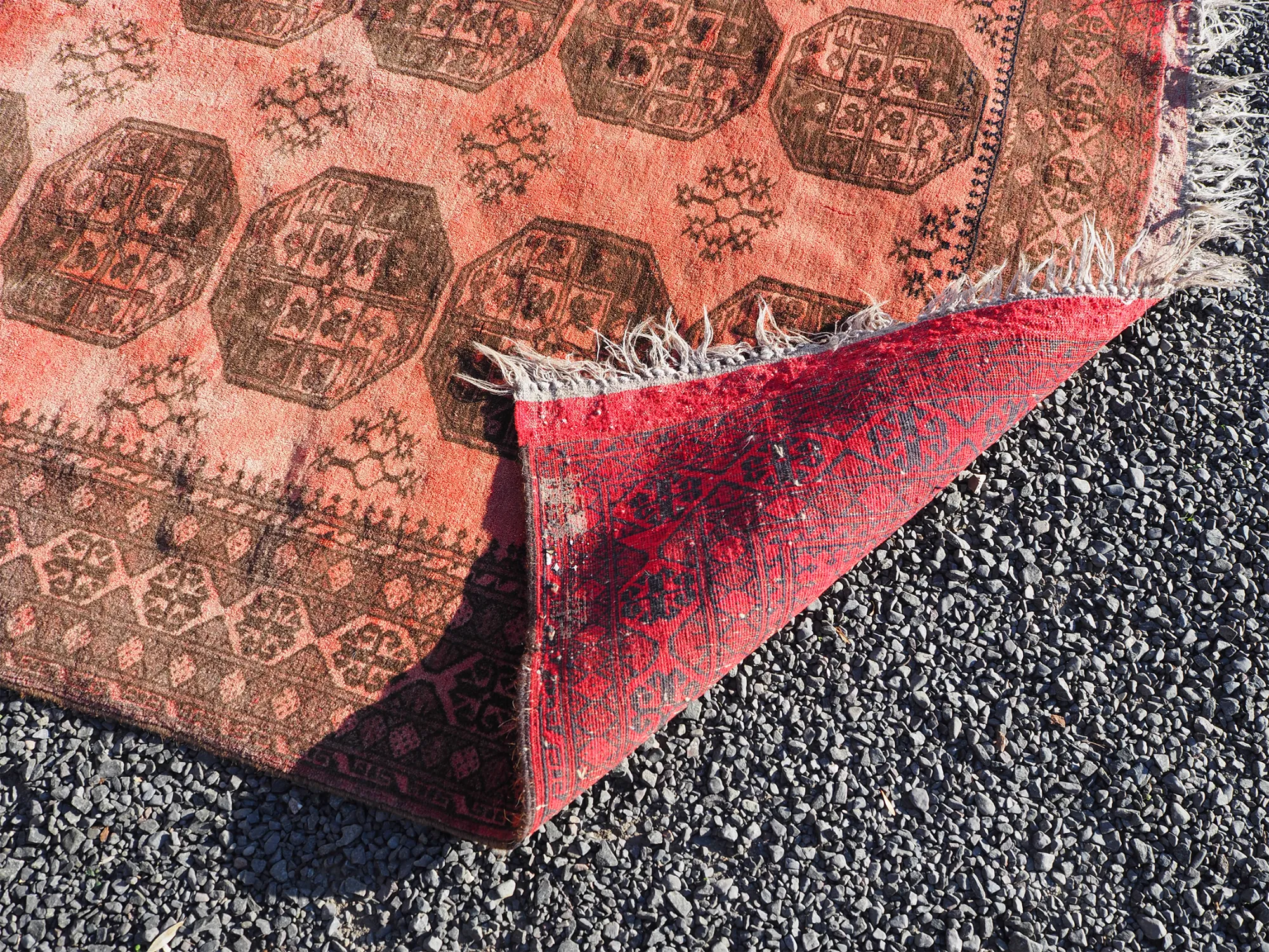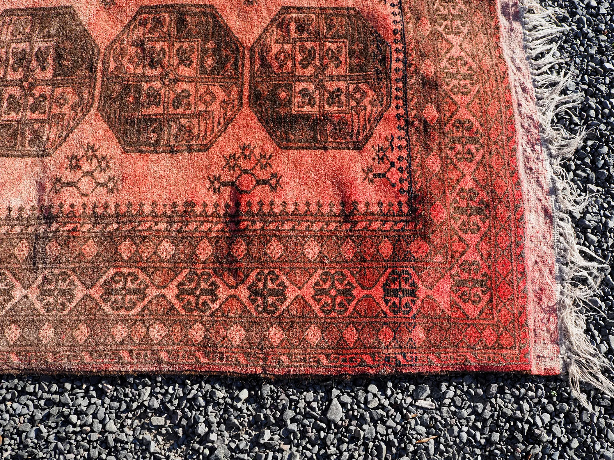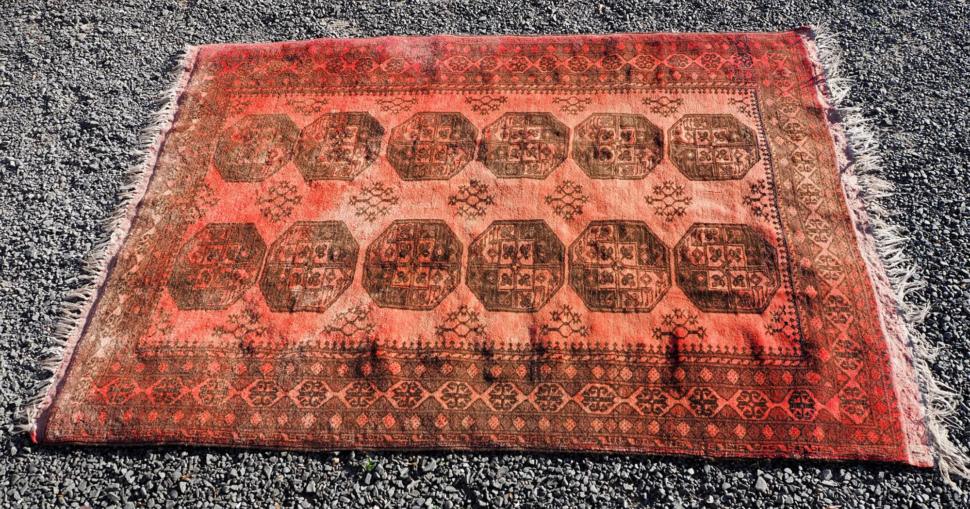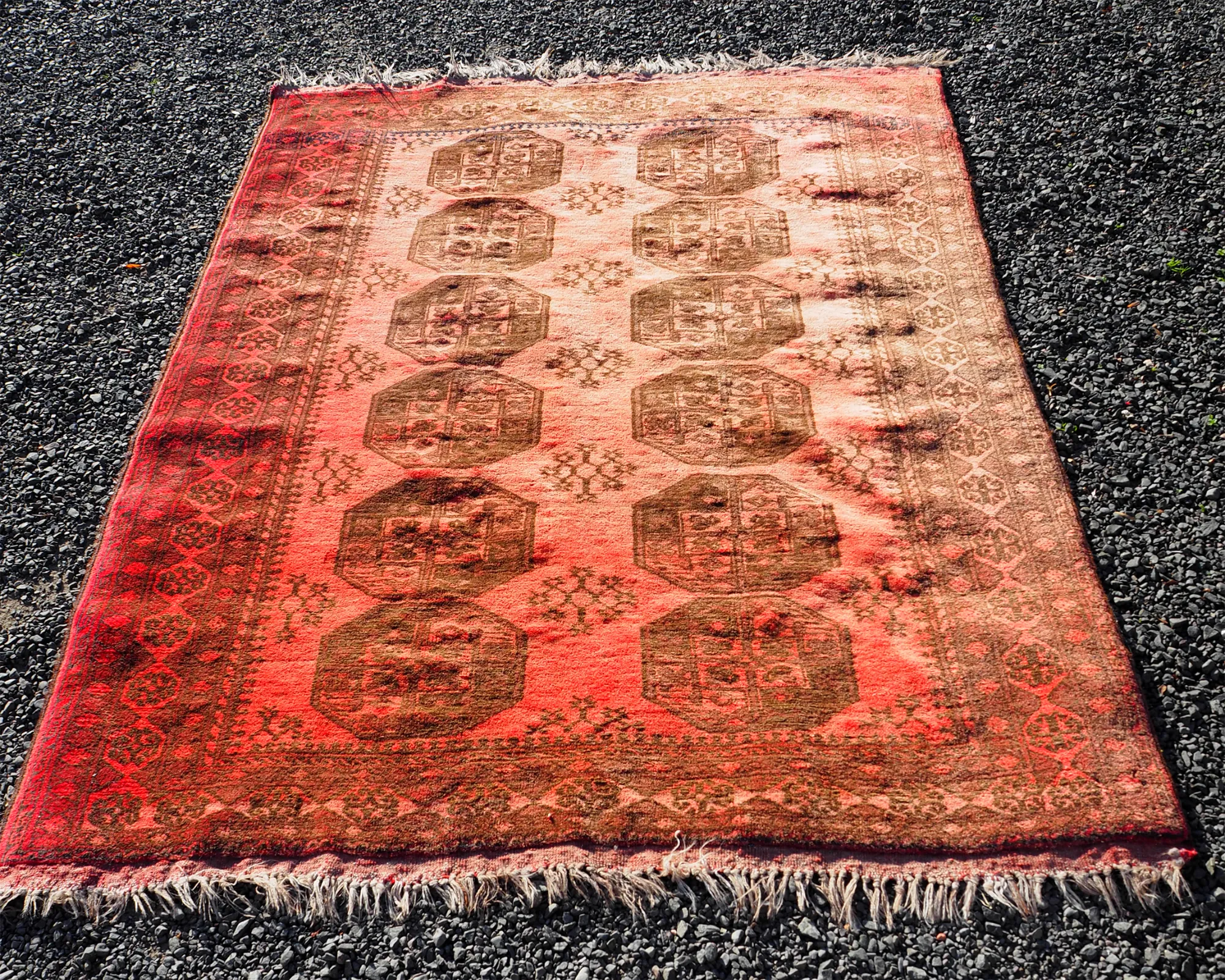 Pretty decent vintage Afghan hand knotted "Elephants foot" design carpet in mainly reds. Nice design and colour. Good condition with hardly any wear.