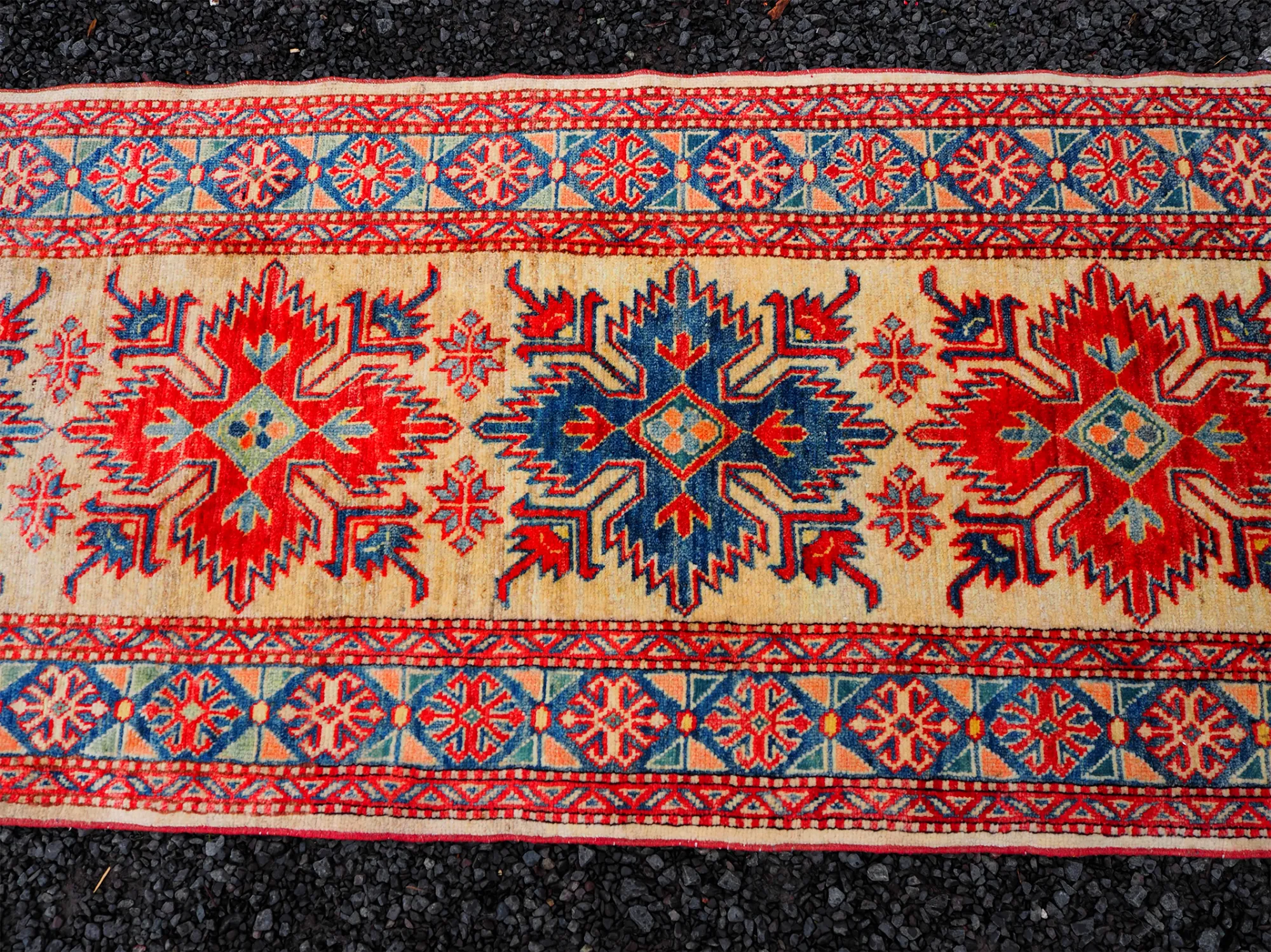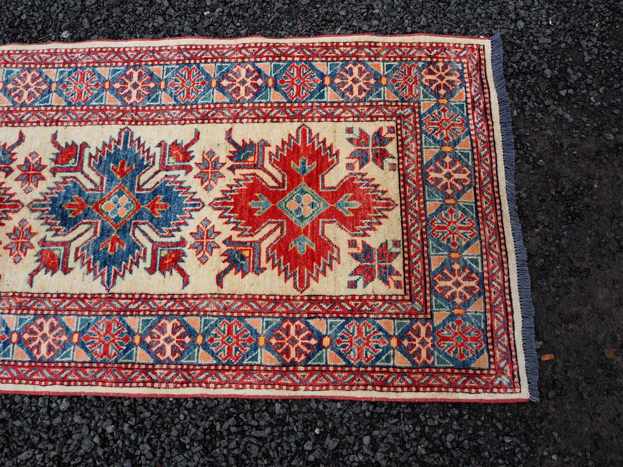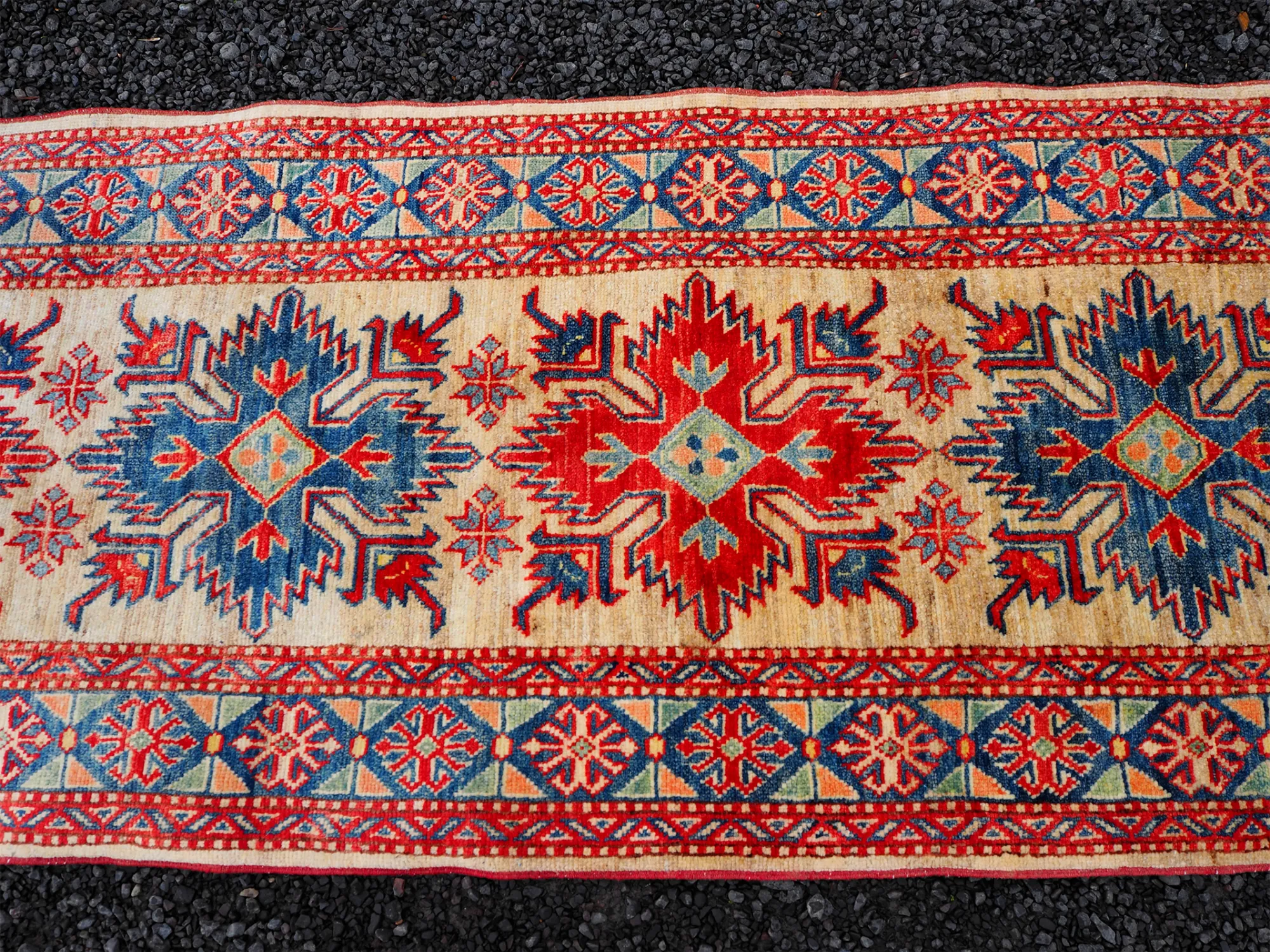Fine quality and condition Vintage Afghan Kazak hand knotted wool runner of a great size. Typical Kazak design and colours. Really nice one.