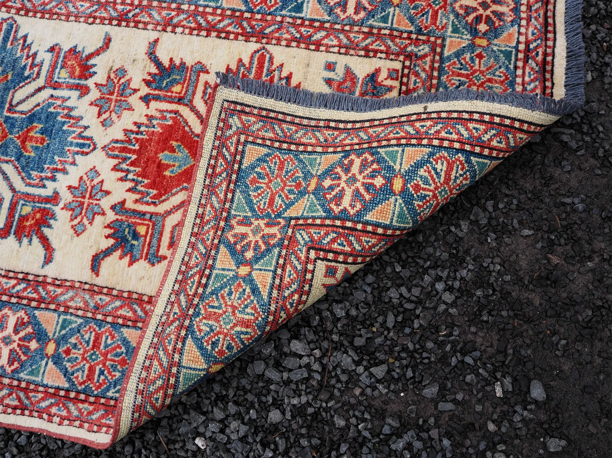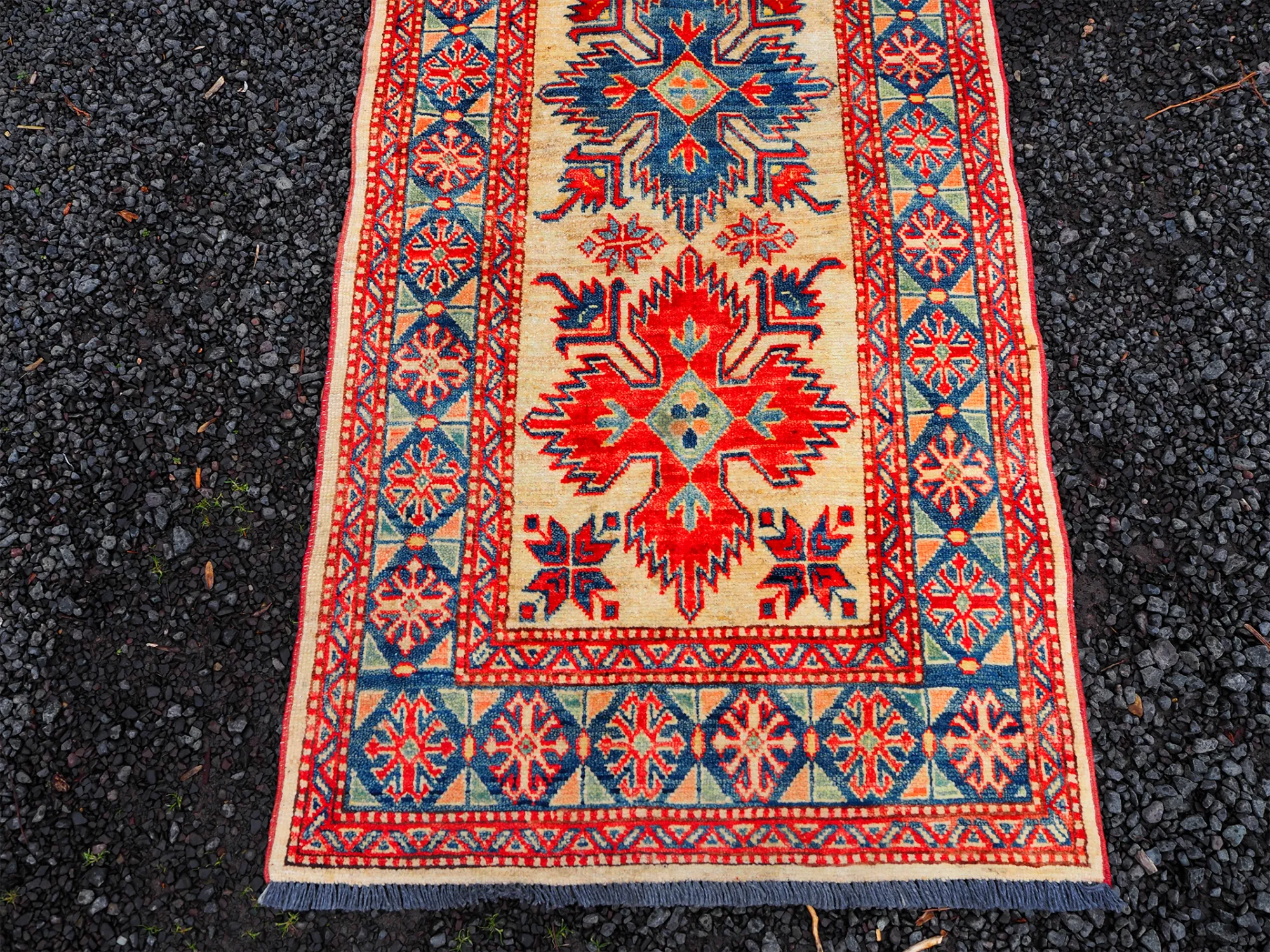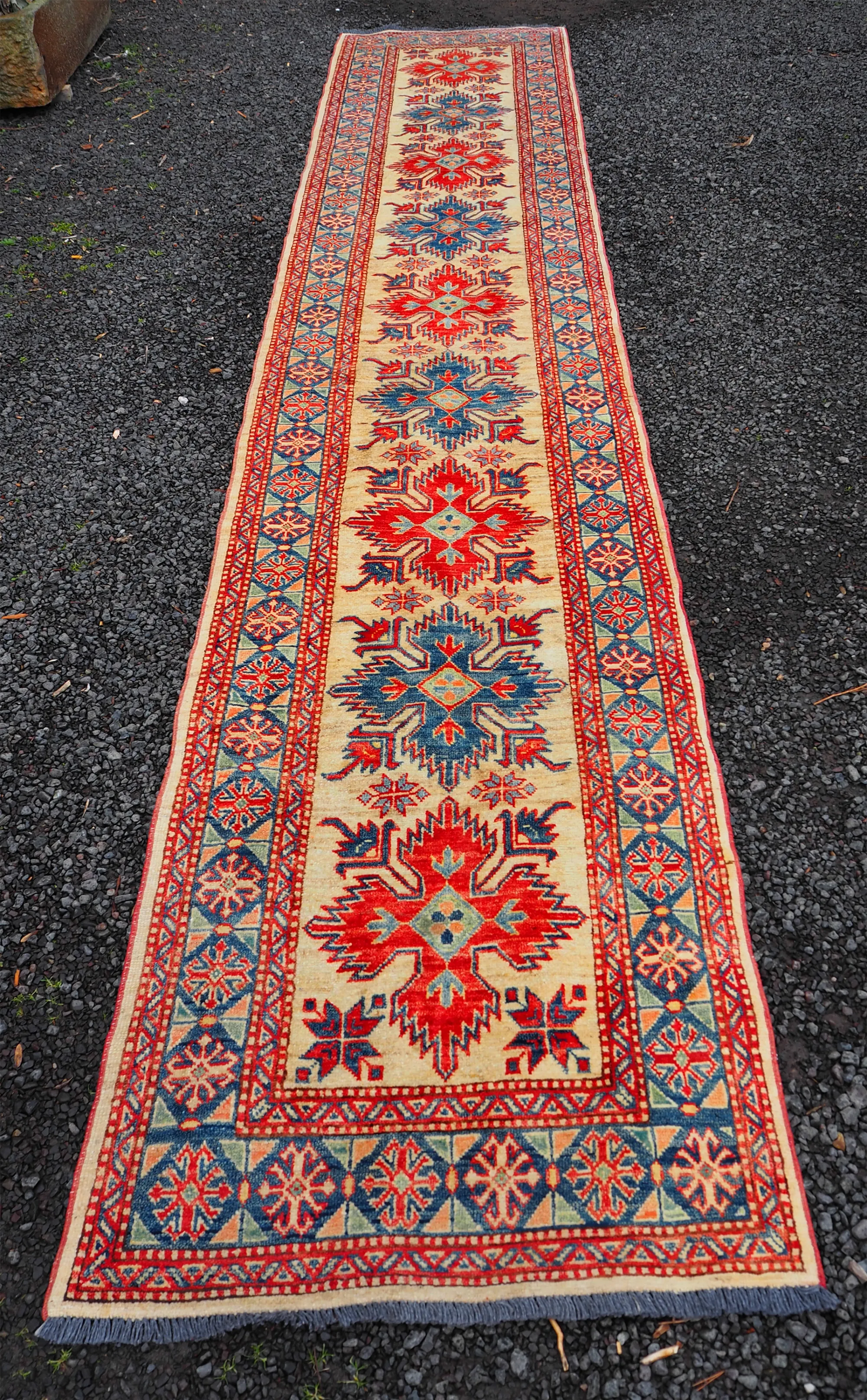Fine quality and condition Vintage Afghan Kazak hand knotted wool runner of a great size. Typical Kazak design and colours. Really nice one.