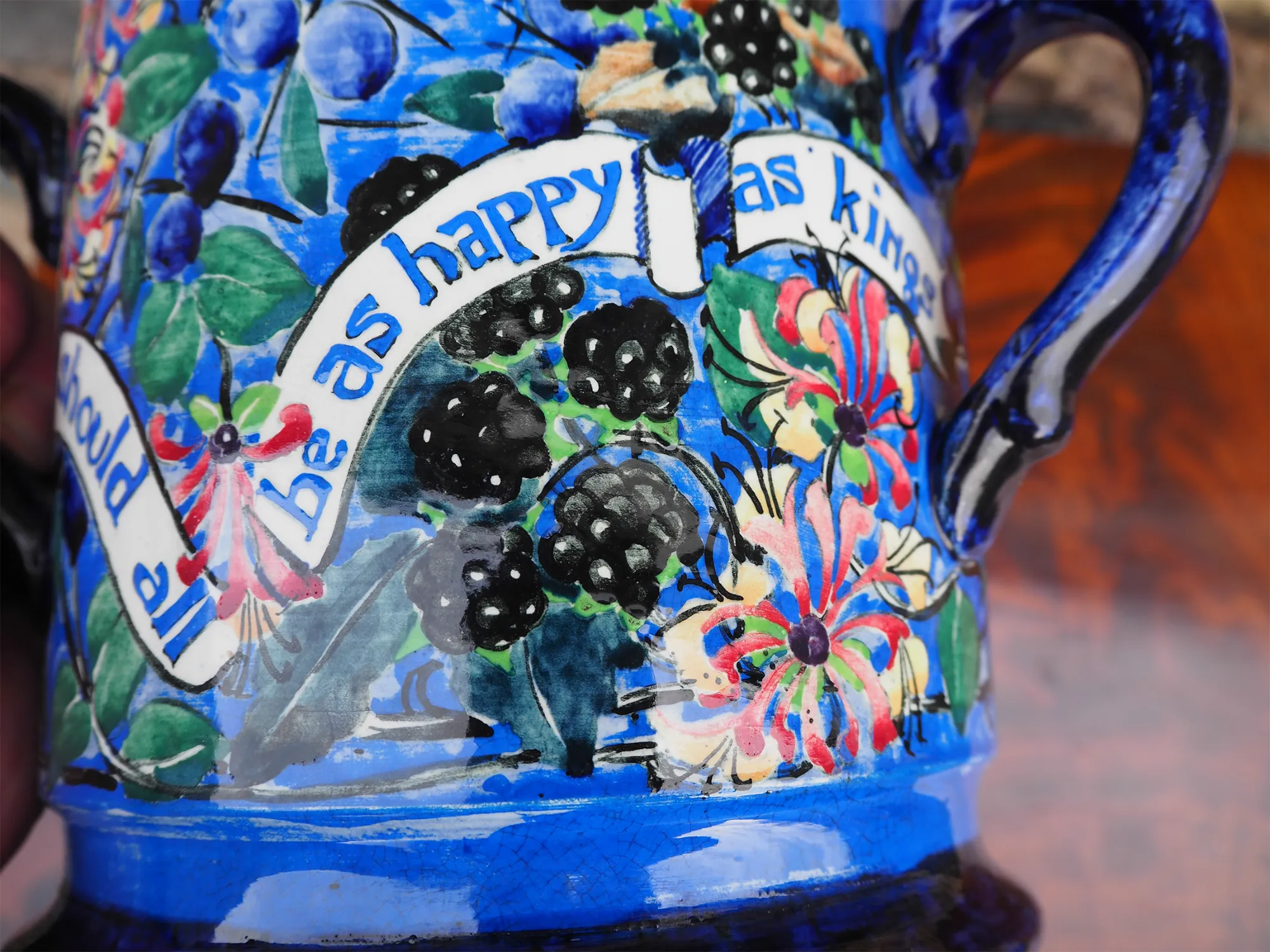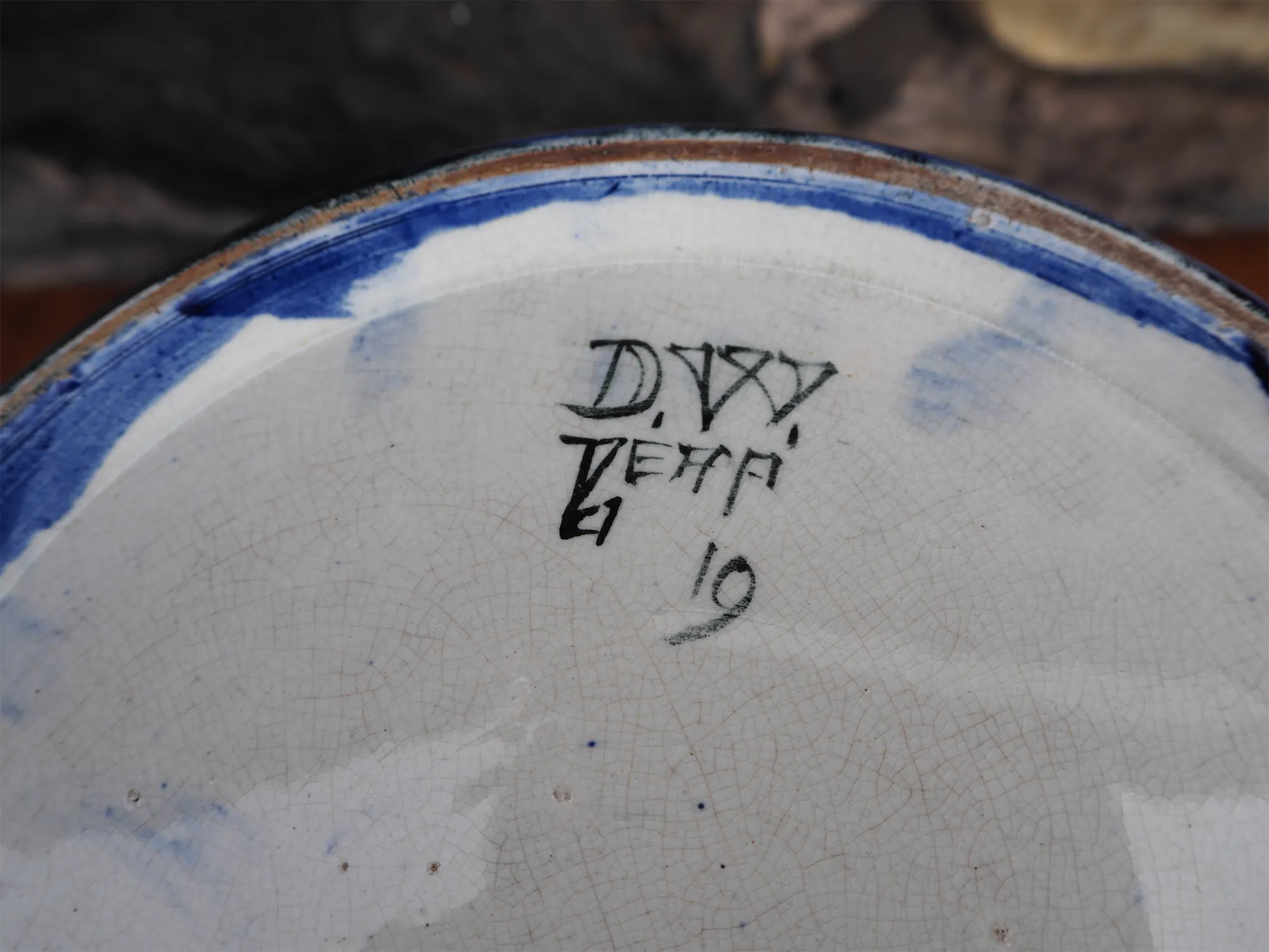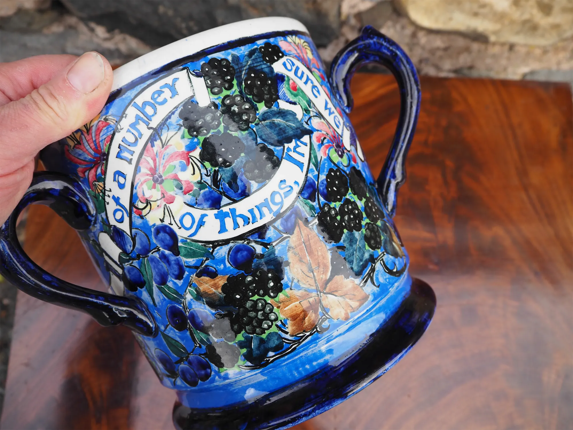 SUPERB & RARE early 20th century Scottish studio pottery large size 3 handled tyg by Bough pottery, Edinburgh and decorated by DOLLY WATSON. This incredibly well painted piece is rare, especially being by Dolly Watson. The design and colours are stunning. Amongst the design are the first few lines of a famous poem. The condition is very good apart from one small hairline, all the handles are un-damaged. An incredible piece of early 20th century Scottish pottery.